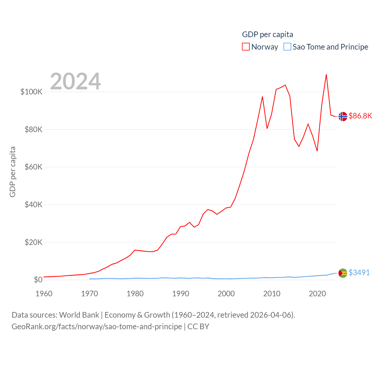 By GDP, Norway ranks 32/197 ($484B) and Sao Tome and Principe ranks 189/197 ($822M). By GDP per capita, Norway ranks 8/197 ($86,785), while Sao Tome and Principe ranks 134/197 ($3,491).