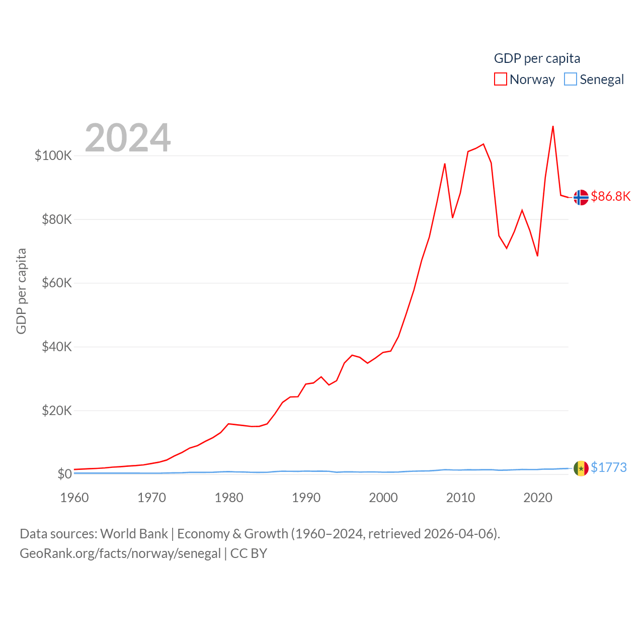 By GDP, Norway ranks 32/197 ($484B) and Senegal ranks 109/197 ($32.8B). By GDP per capita, Norway ranks 8/197 ($86,785), while Senegal ranks 159/197 ($1,773).