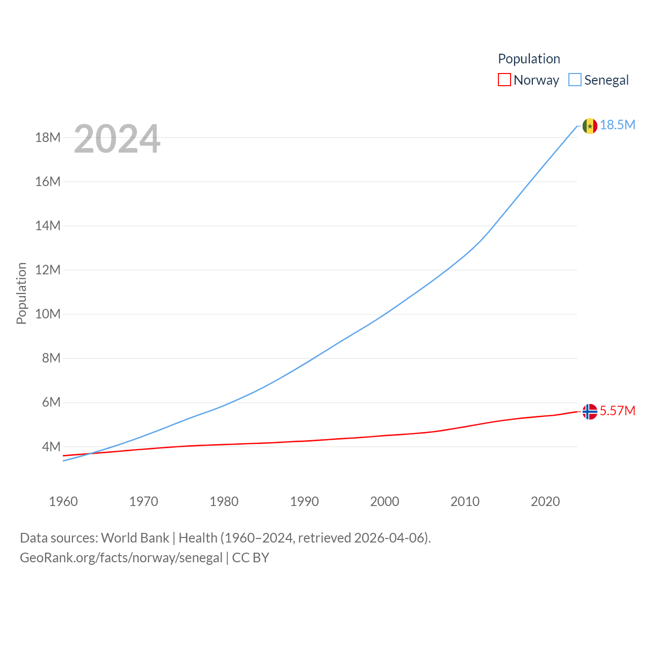 Norway has a population of 5.57M (ranked 118/197), compared with 18.5M in Senegal (ranked 69/197). Norway's land area is 140,645 sq mi versus 74,336 sq mi for Senegal (ranked 62nd vs. 85th).