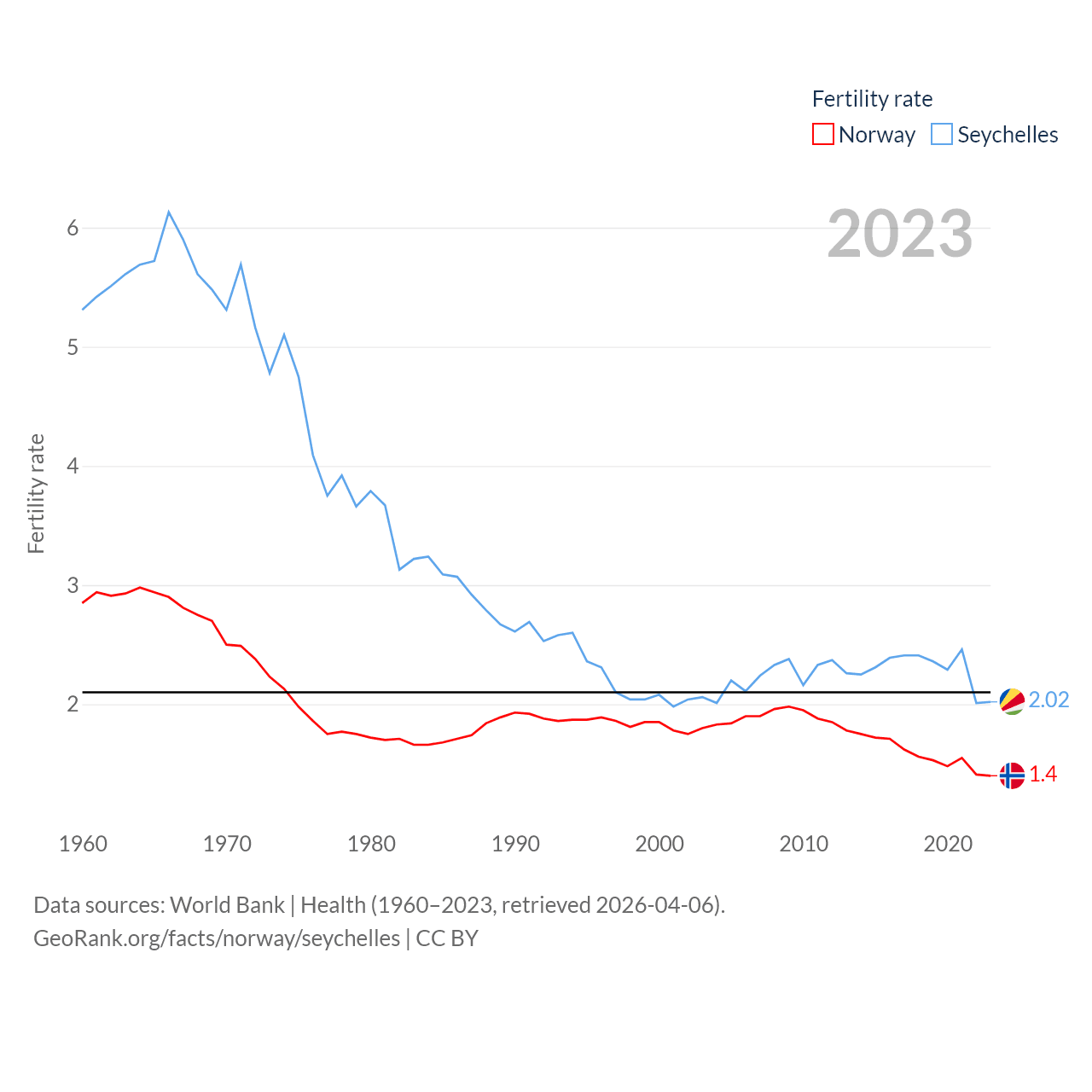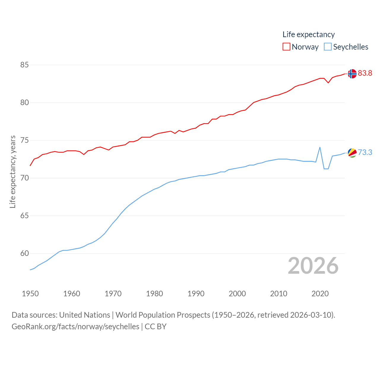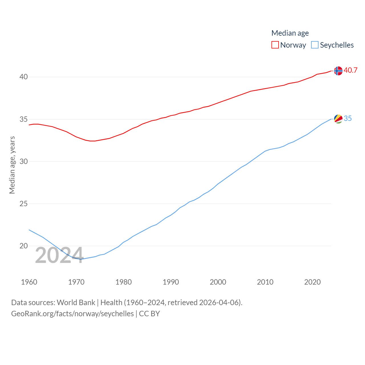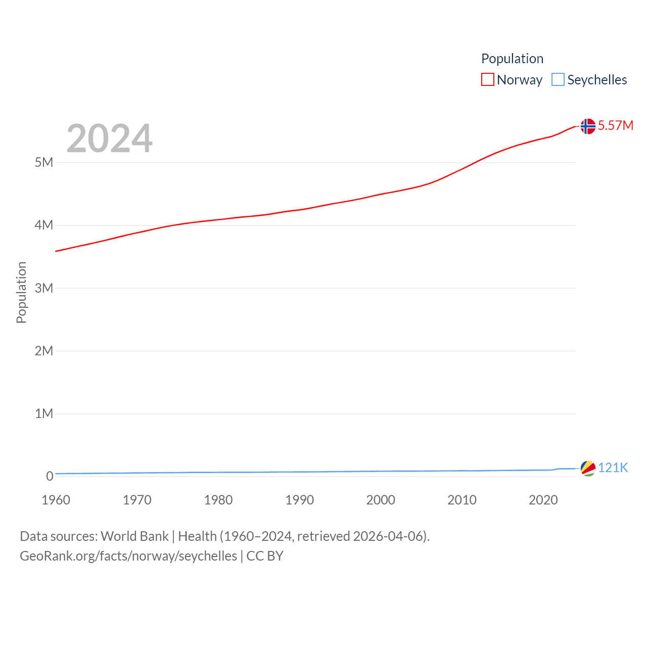 Norway has a population of 5.57M (ranked 118/197), compared with 121K in The Seychelles (ranked 181/197). Norway's land area is 140,645 sq mi versus 177.6 sq mi for The Seychelles (ranked 62nd vs. 181st).
