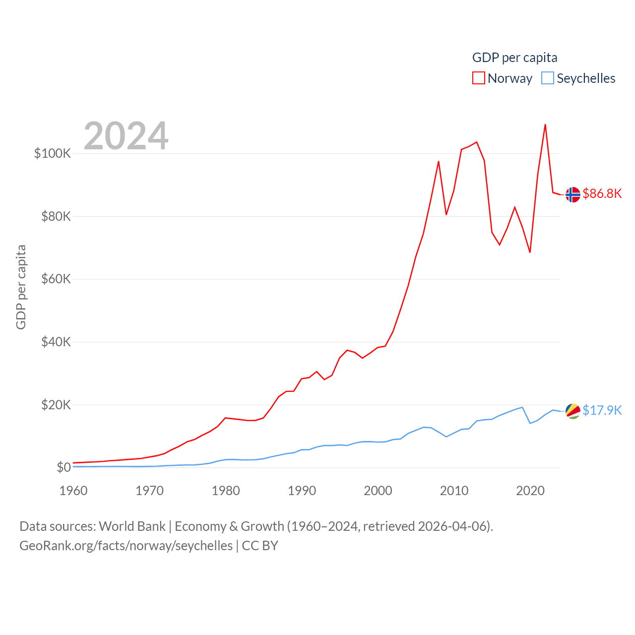By GDP, Norway ranks 32/197 ($484B) and The Seychelles ranks 178/197 ($2.17B). By GDP per capita, Norway ranks 8/197 ($86,785), while The Seychelles ranks 63/197 ($17,859).