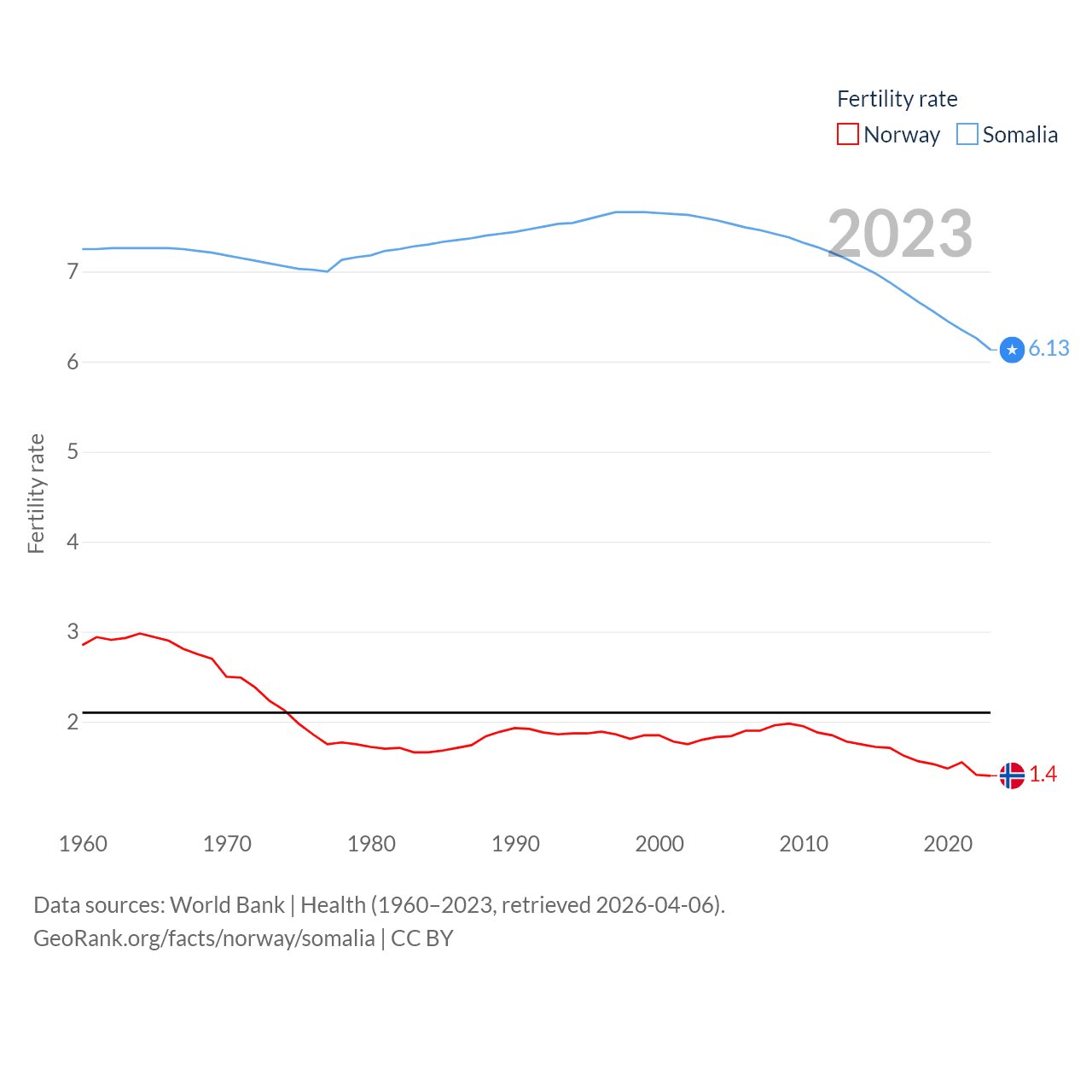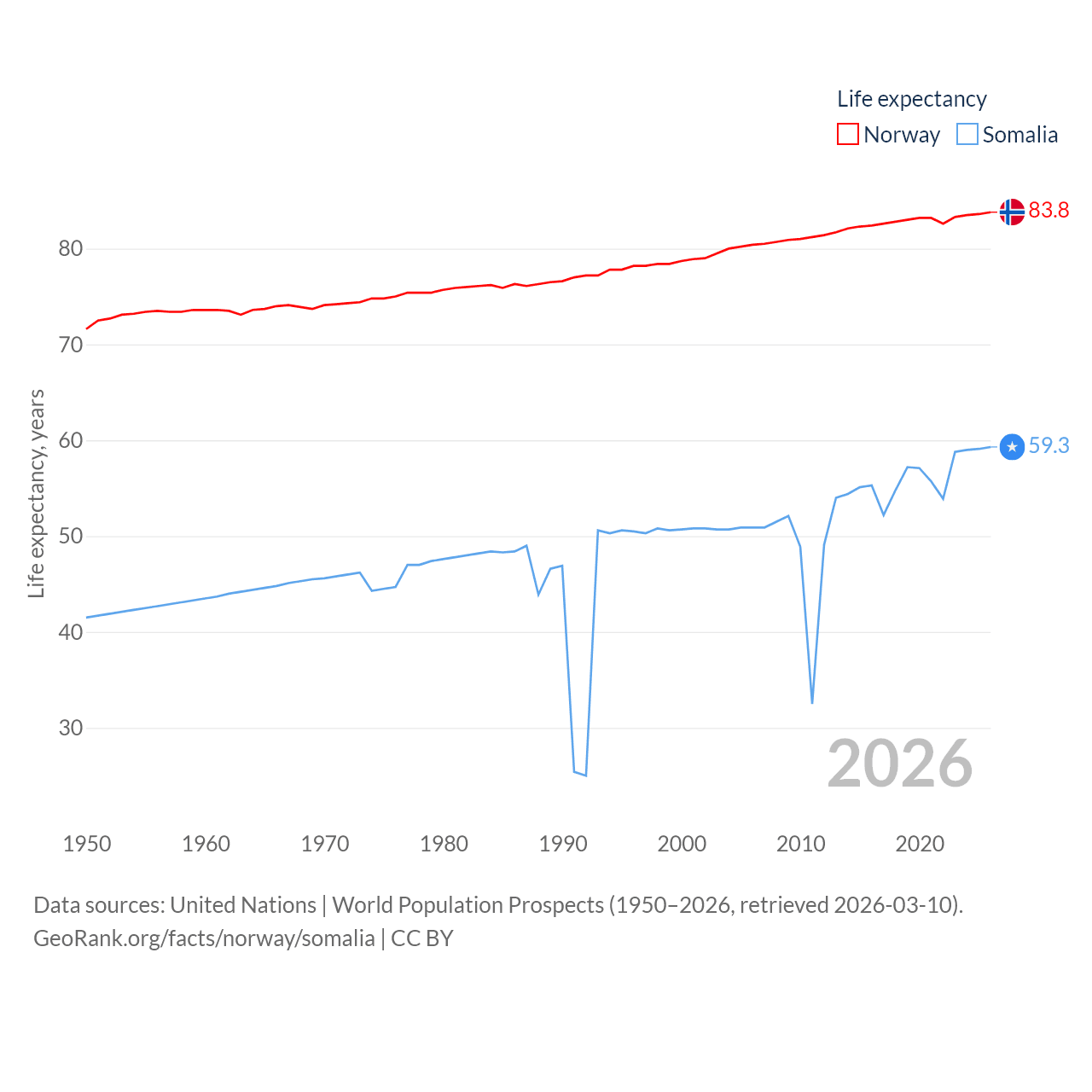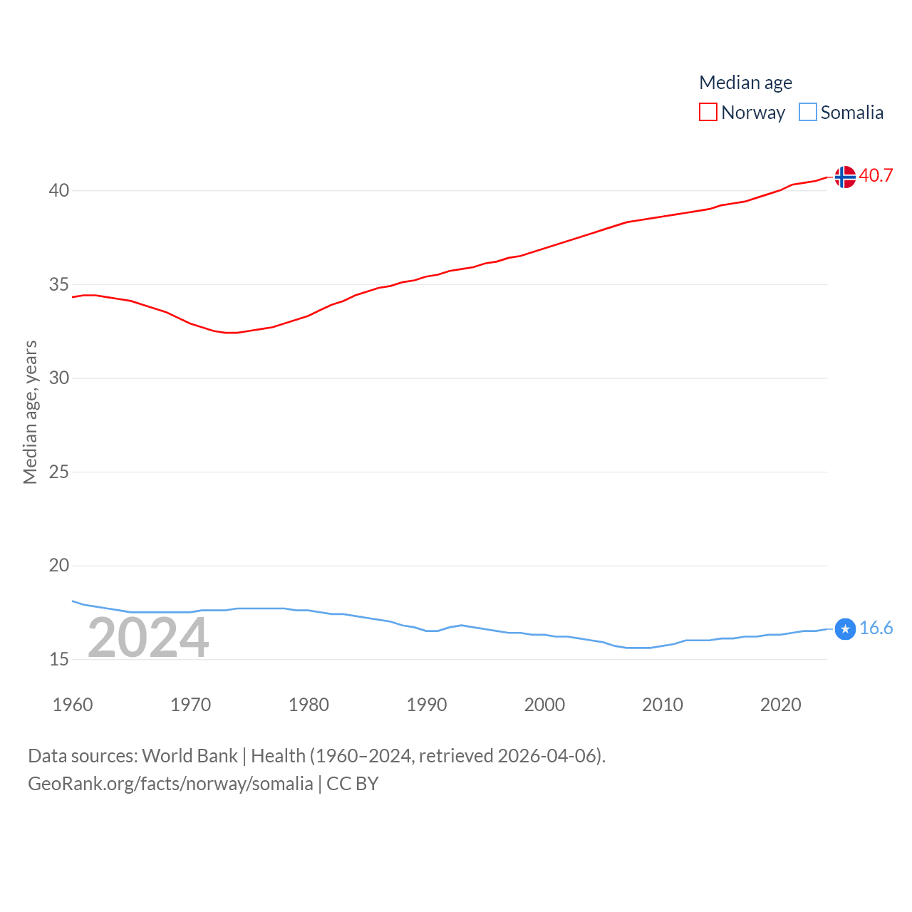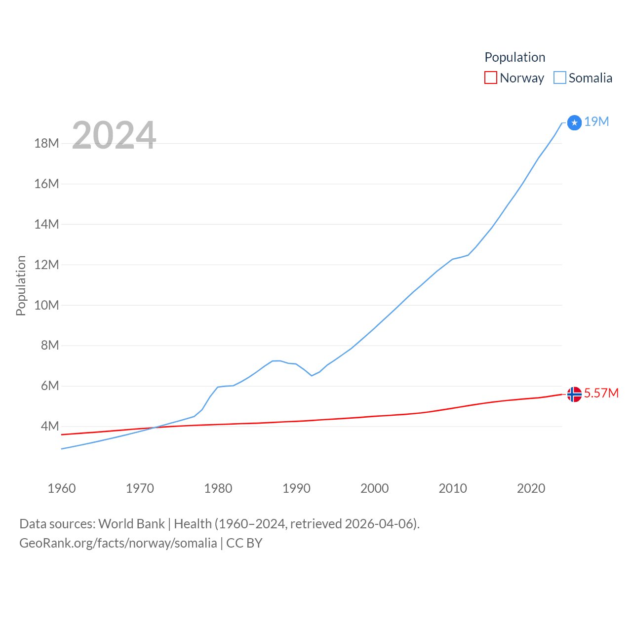 Norway has a population of 5.57M (ranked 118/197), compared with 19M in Somalia (ranked 68/197). Norway's land area is 140,645 sq mi versus 242,217 sq mi for Somalia (ranked 62nd vs. 42nd).
