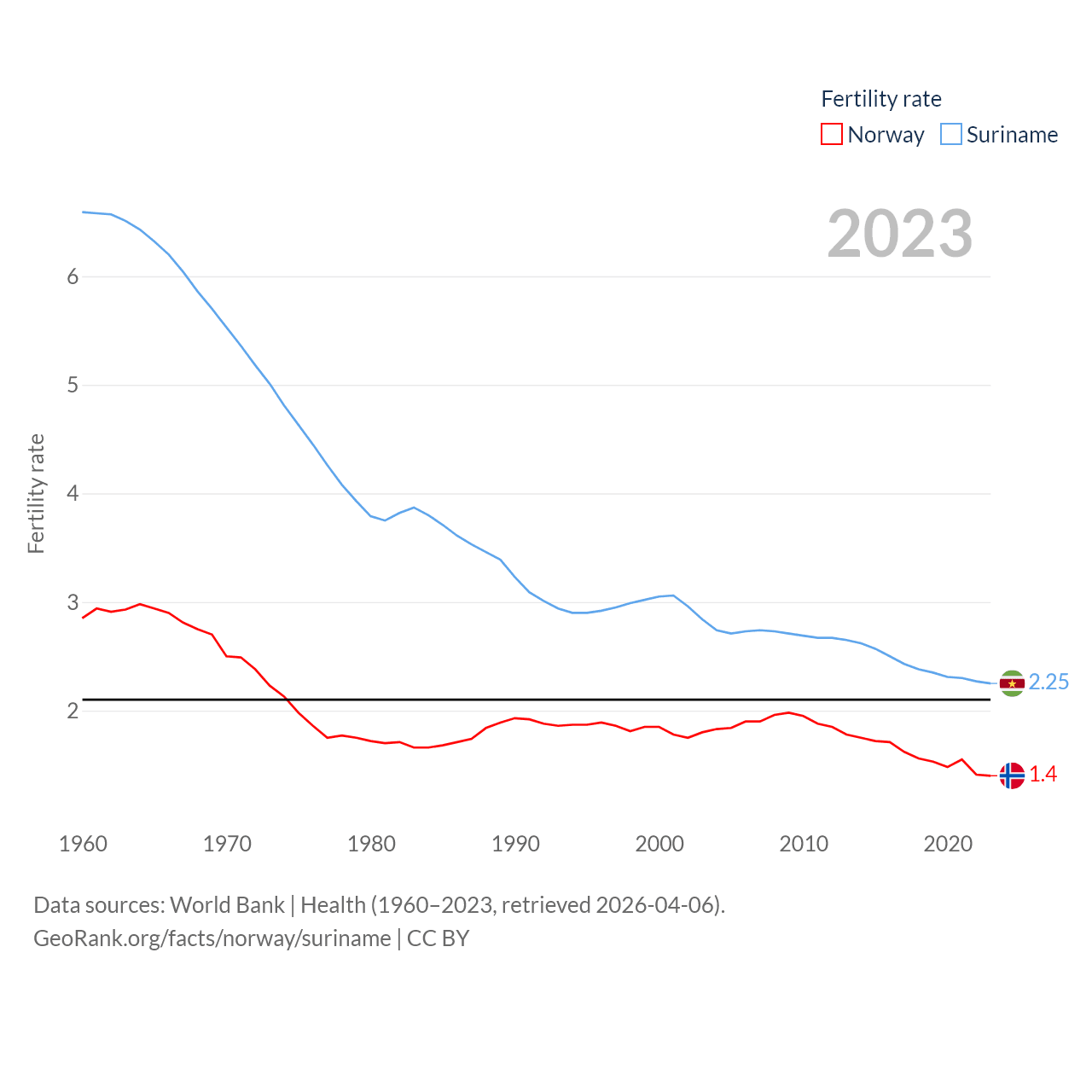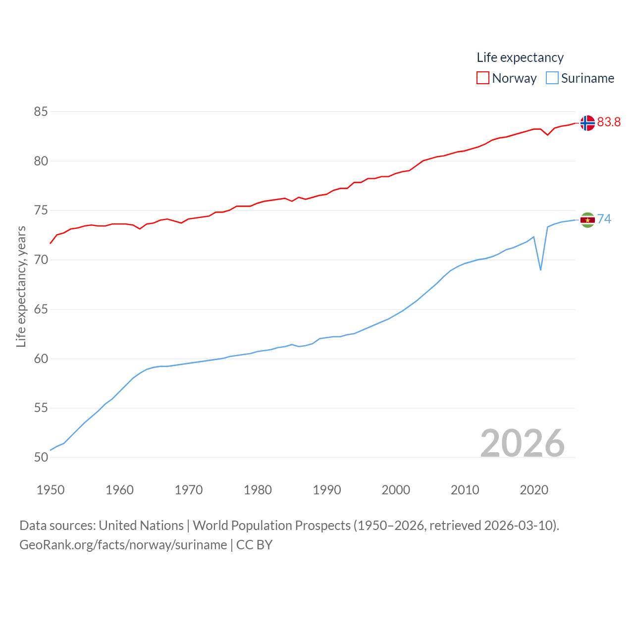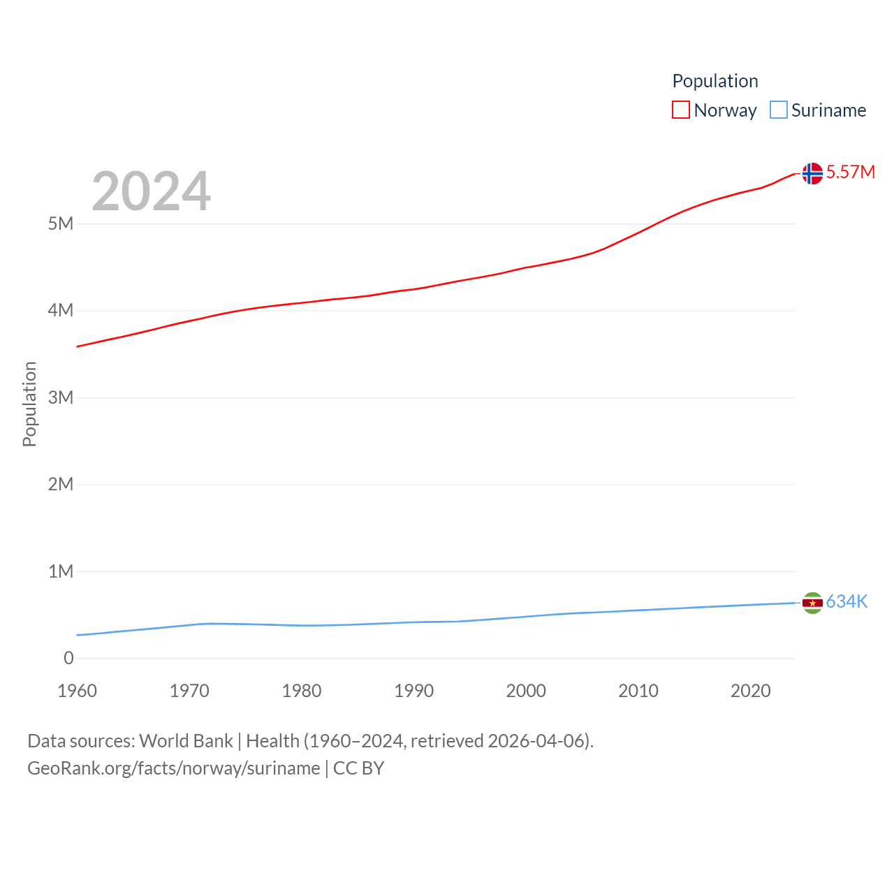 Norway has a population of 5.57M (ranked 118/197), compared with 634K in Suriname (ranked 165/197). Norway's land area is 140,645 sq mi versus 61,972 sq mi for Suriname (ranked 62nd vs. 90th).