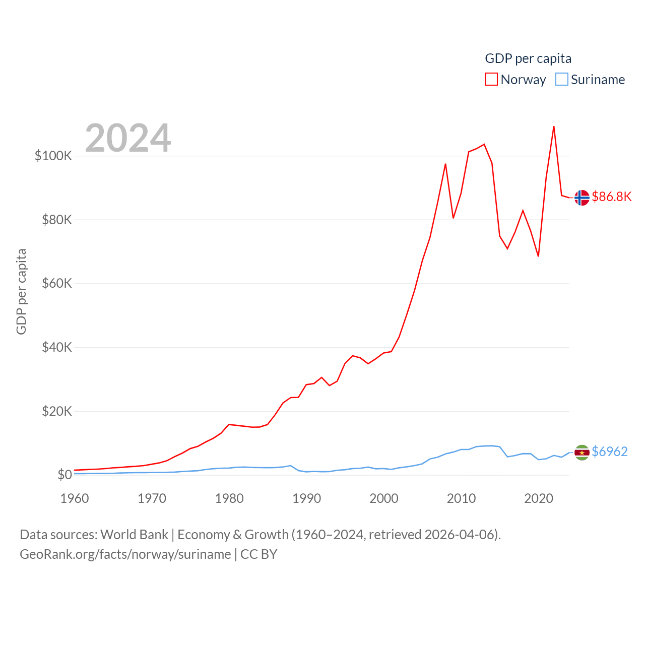 By GDP, Norway ranks 32/197 ($484B) and Suriname ranks 164/197 ($4.42B). By GDP per capita, Norway ranks 8/197 ($86,785), while Suriname ranks 102/197 ($6,962).