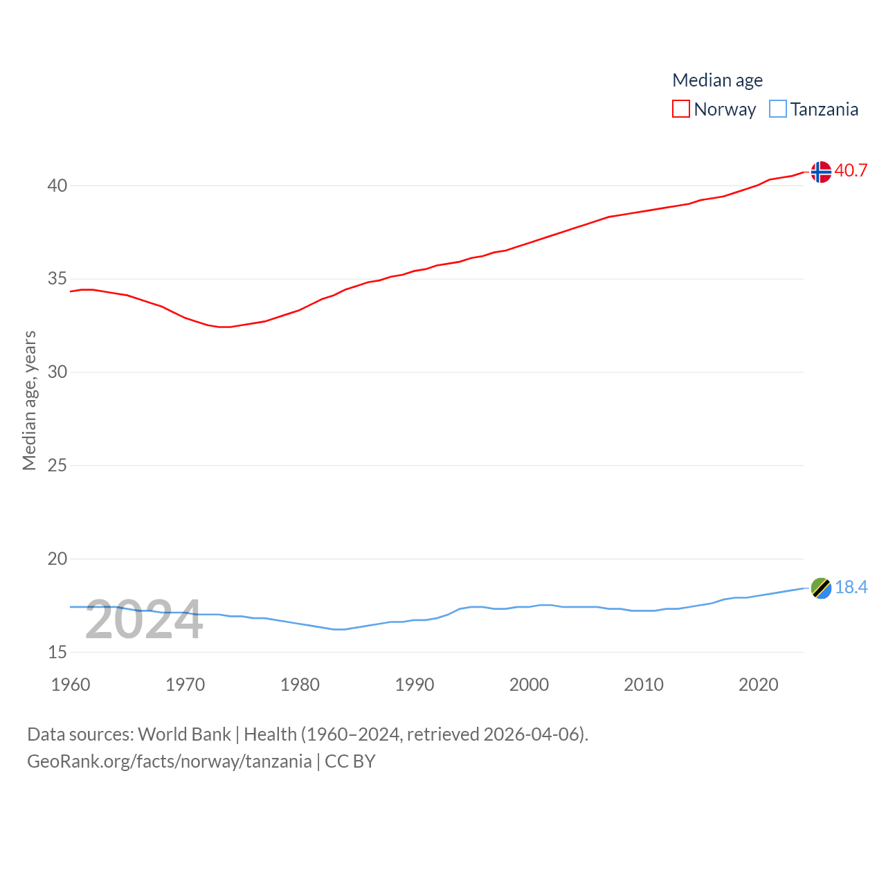 Norway has a population of 5.57M (ranked 118/197), compared with 68.6M in Tanzania (ranked 22/197). Norway's land area is 140,645 sq mi versus 342,009 sq mi for Tanzania (ranked 62nd vs. 31st).