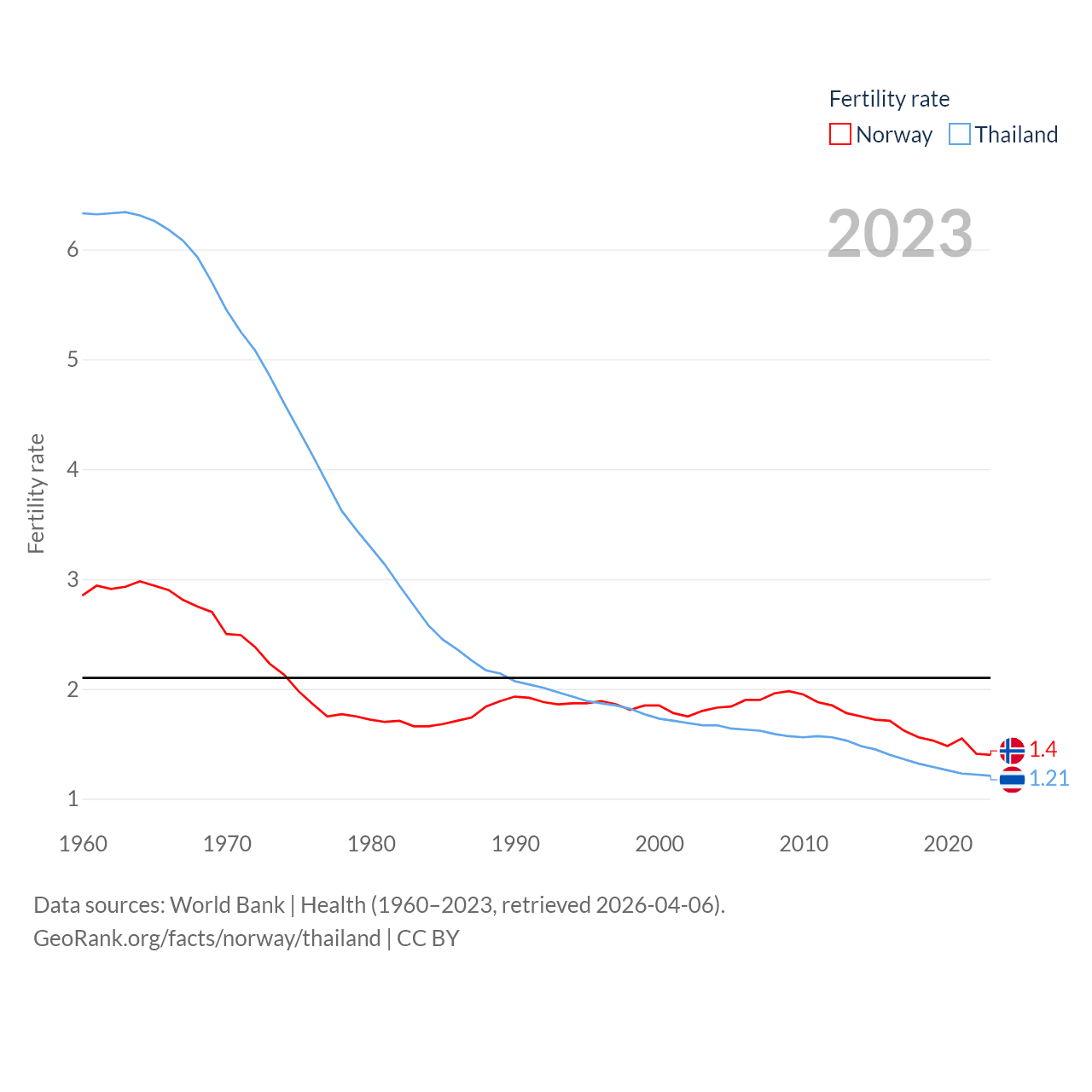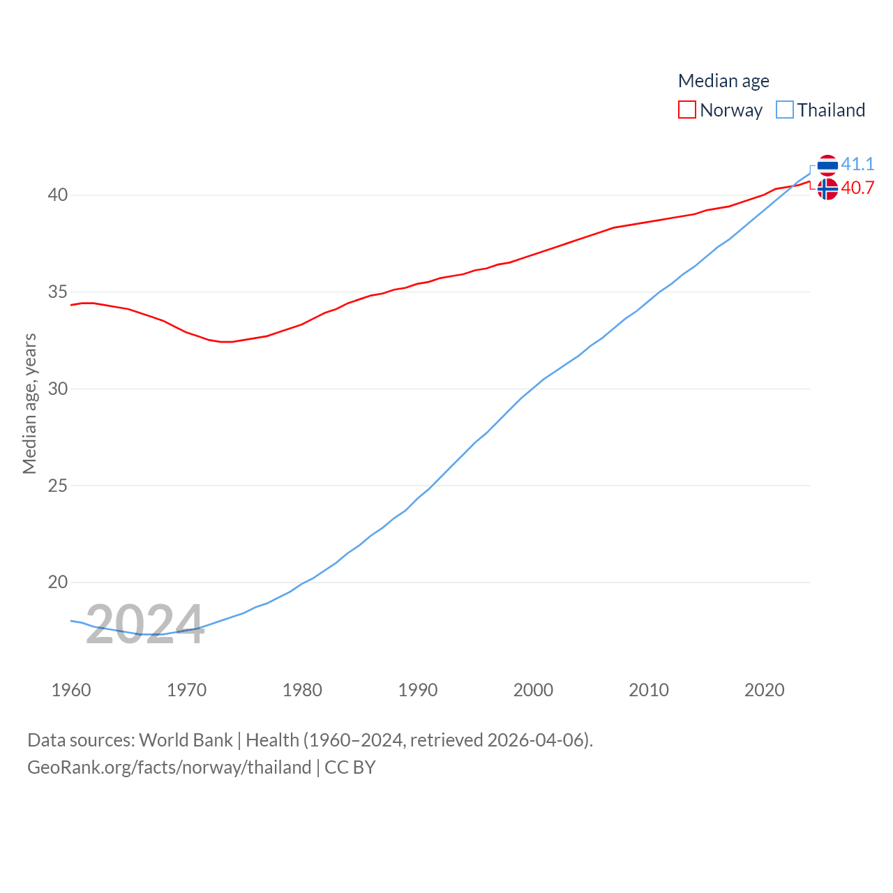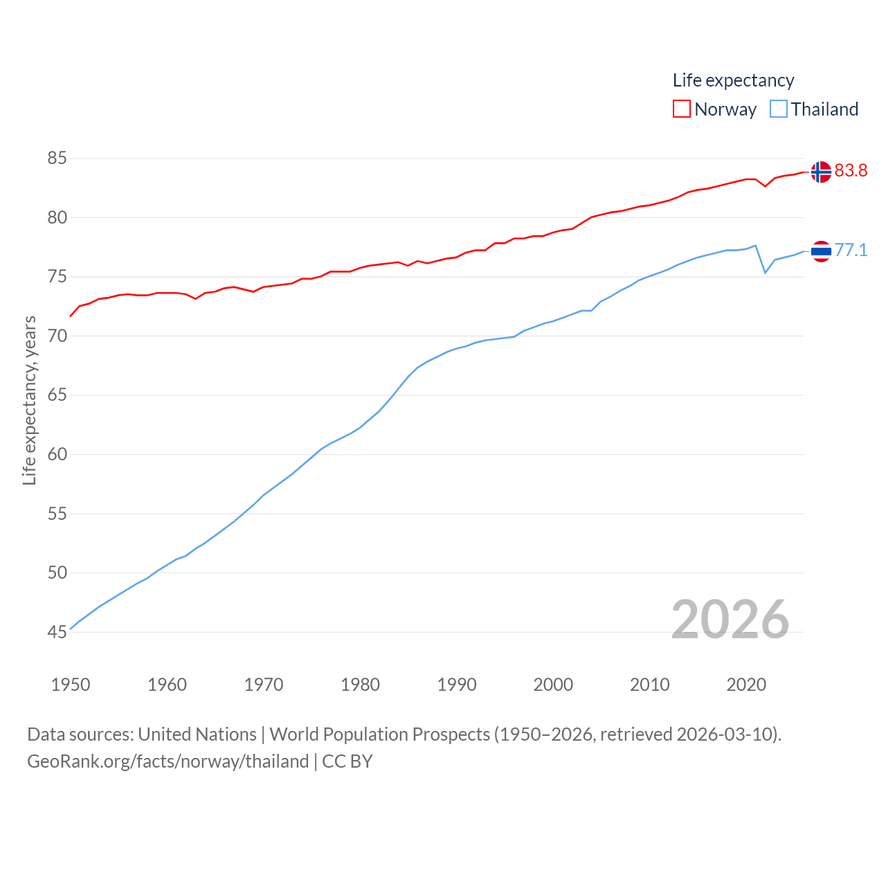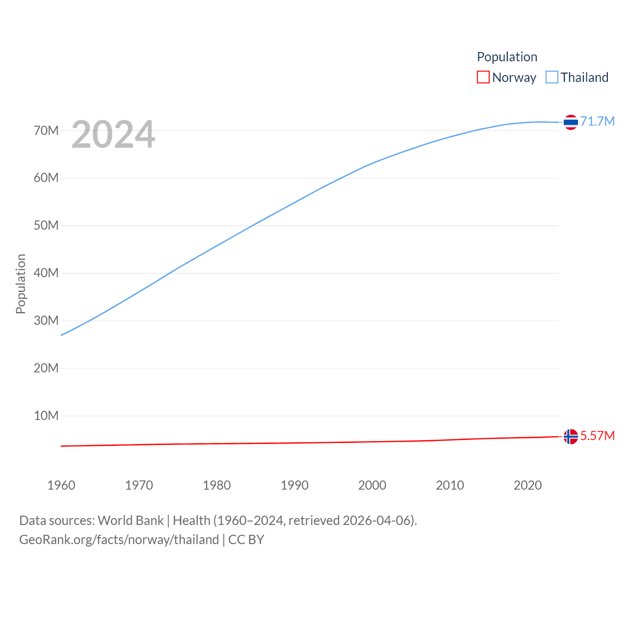 Norway has a population of 5.57M (ranked 118/197), compared with 71.7M in Thailand (ranked 20/197). Norway's land area is 140,645 sq mi versus 197,256 sq mi for Thailand (ranked 62nd vs. 50th).