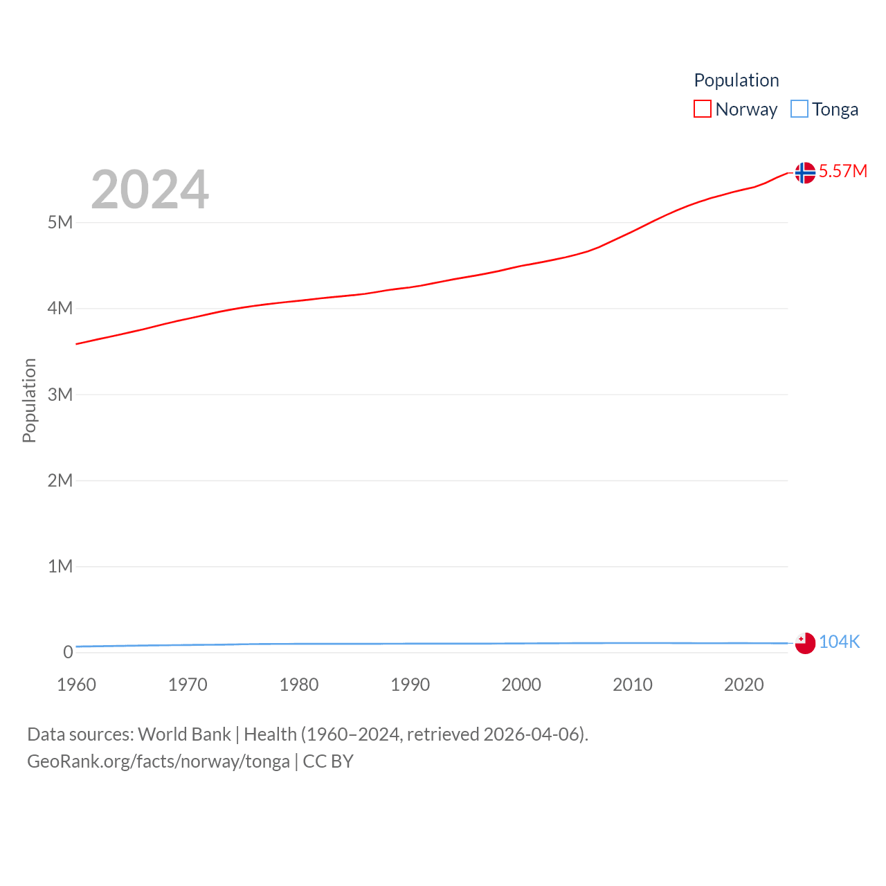 Norway has a population of 5.57M (ranked 118/197), compared with 104K in Tonga (ranked 183/197). Norway's land area is 140,645 sq mi versus 278 sq mi for Tonga (ranked 62nd vs. 176th).