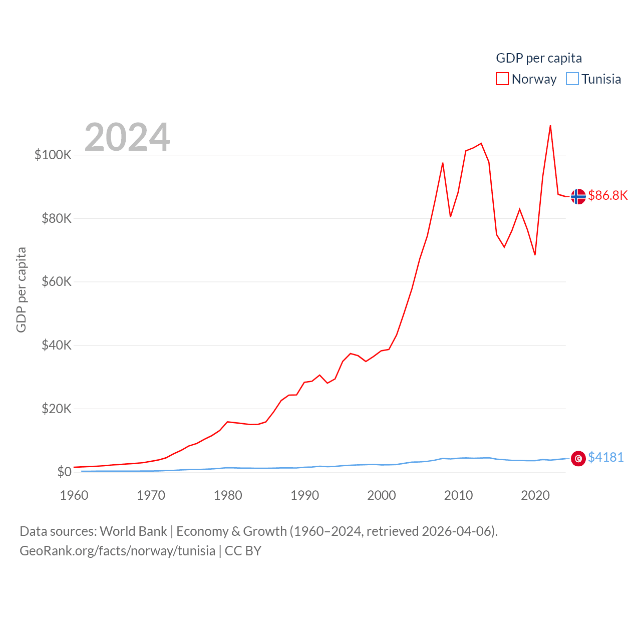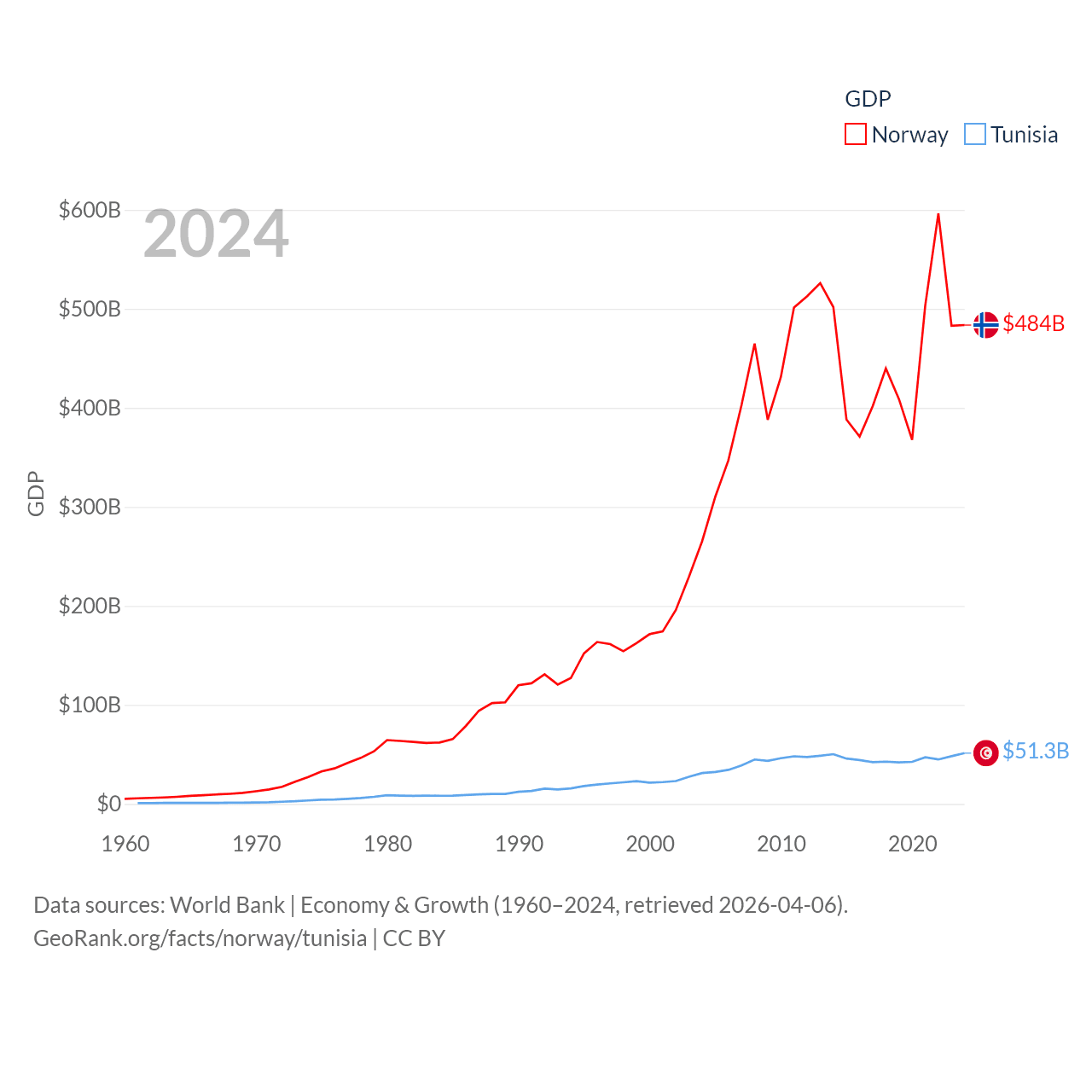 By GDP, Norway ranks 32/197 ($484B) and Tunisia ranks 93/197 ($51.3B). By GDP per capita, Norway ranks 8/197 ($86,785), while Tunisia ranks 129/197 ($4,181).