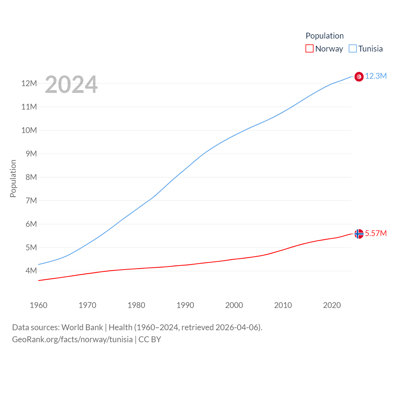 Norway has a population of 5.57M (ranked 118/197), compared with 12.3M in Tunisia (ranked 80/197). Norway's land area is 140,645 sq mi versus 59,985 sq mi for Tunisia (ranked 62nd vs. 91st).