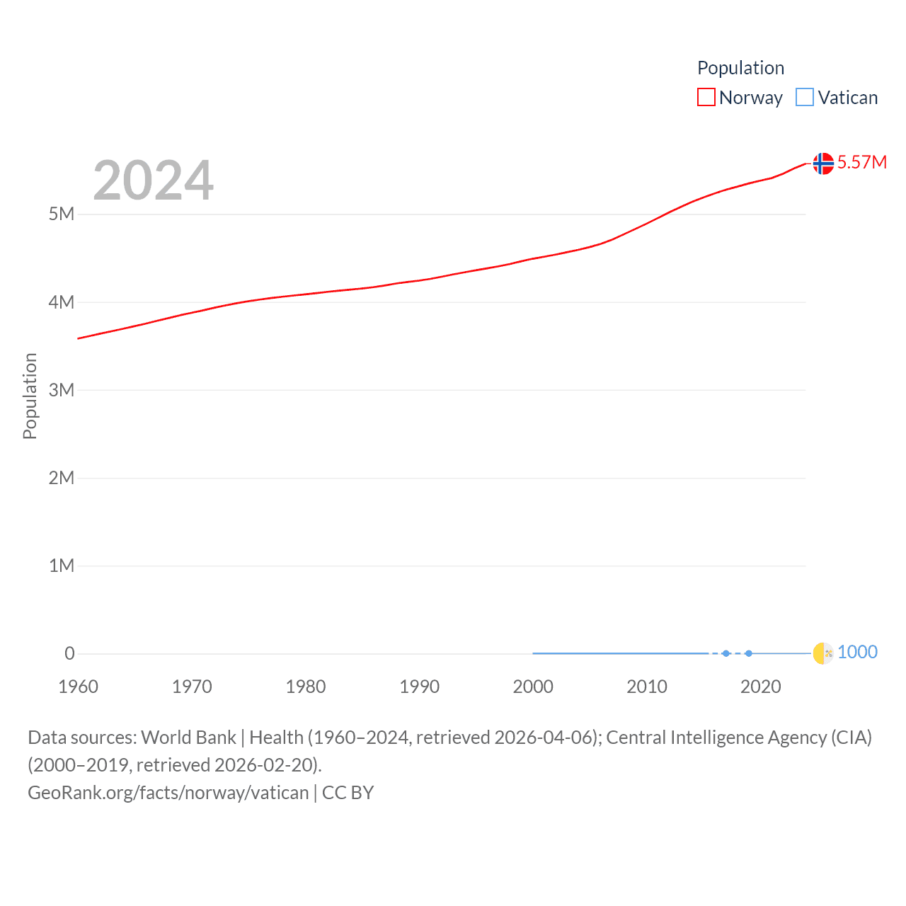 Norway has a population of 5.57M (ranked 118/197), compared with 1K in The Vatican (ranked 197/197). Norway's land area is 140,645 sq mi versus 0.17 sq mi for The Vatican (ranked 62nd vs. 197th).
