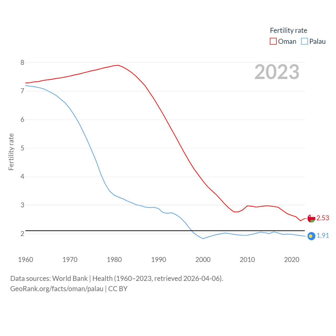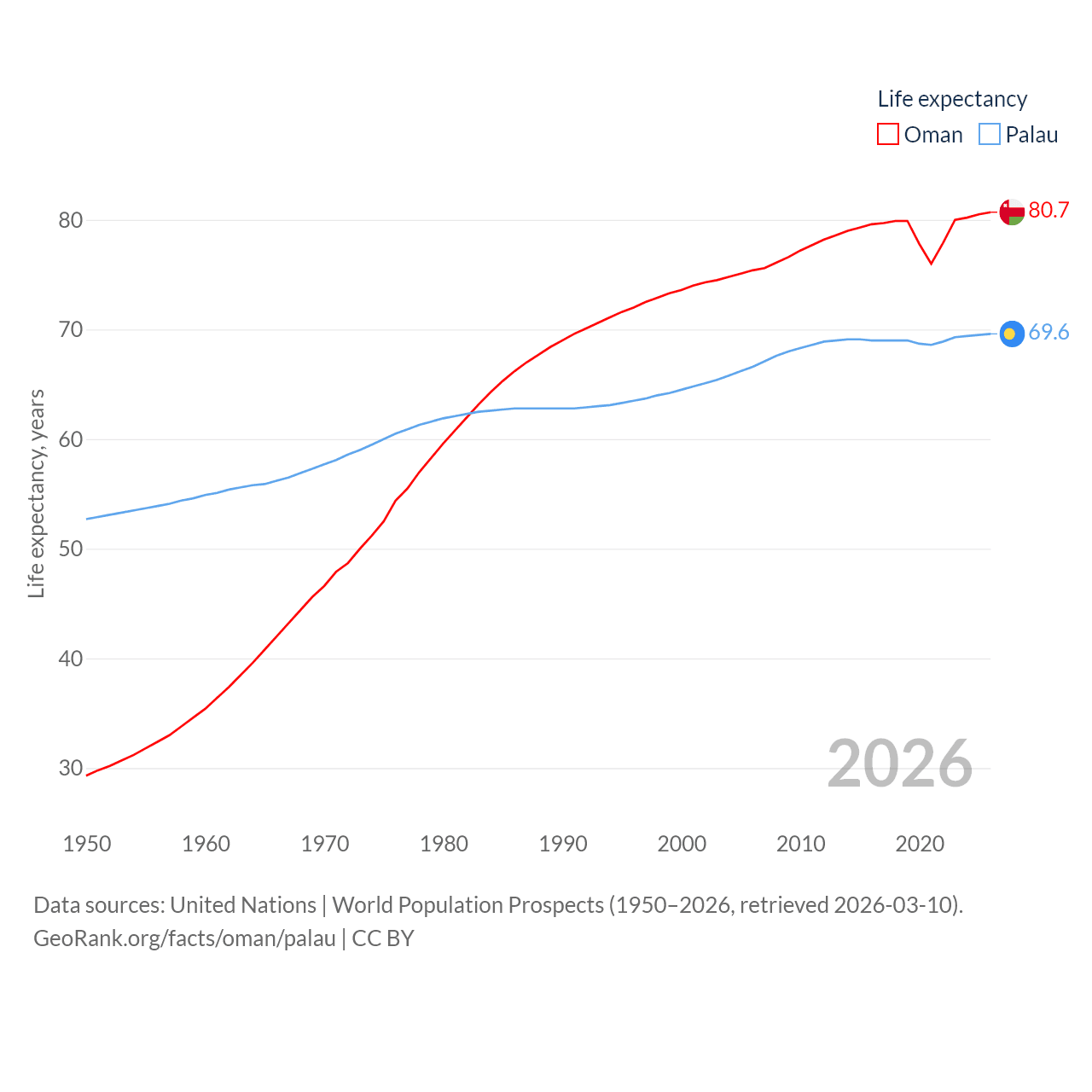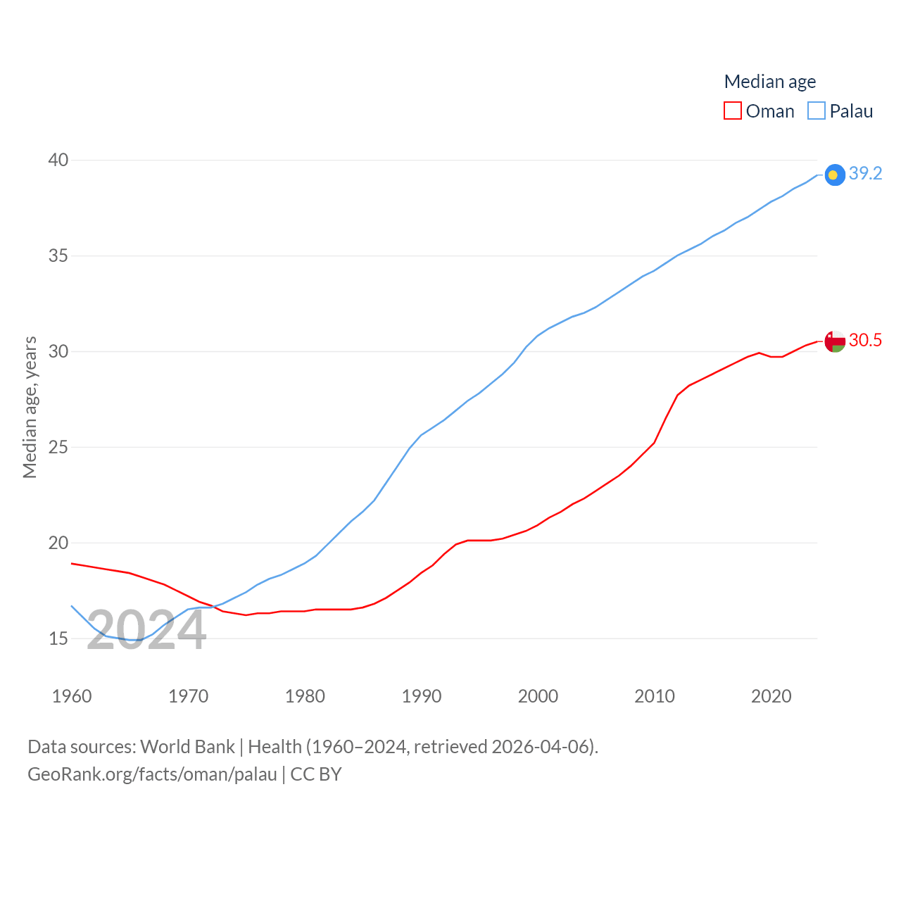 Oman has a population of 5.28M (ranked 124/197), compared with 17.7K in Palau (ranked 194/197). Oman's land area is 119,499 sq mi versus 177.6 sq mi for Palau (ranked 68th vs. 180th).