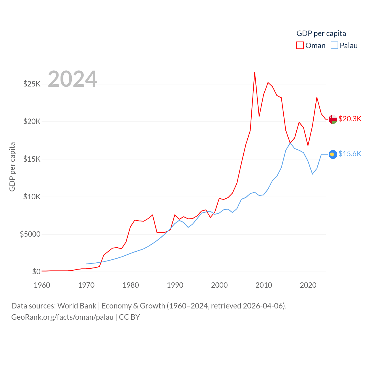 By GDP, Oman ranks 70/197 ($107B) and Palau ranks 194/197 ($277M). By GDP per capita, Oman ranks 57/197 ($20,285), while Palau ranks 67/197 ($15,611).