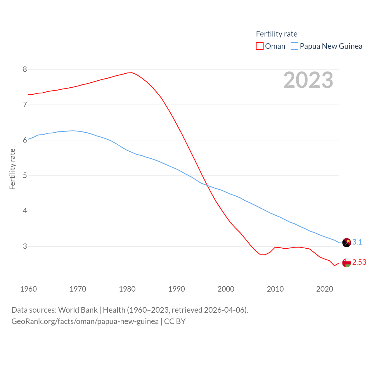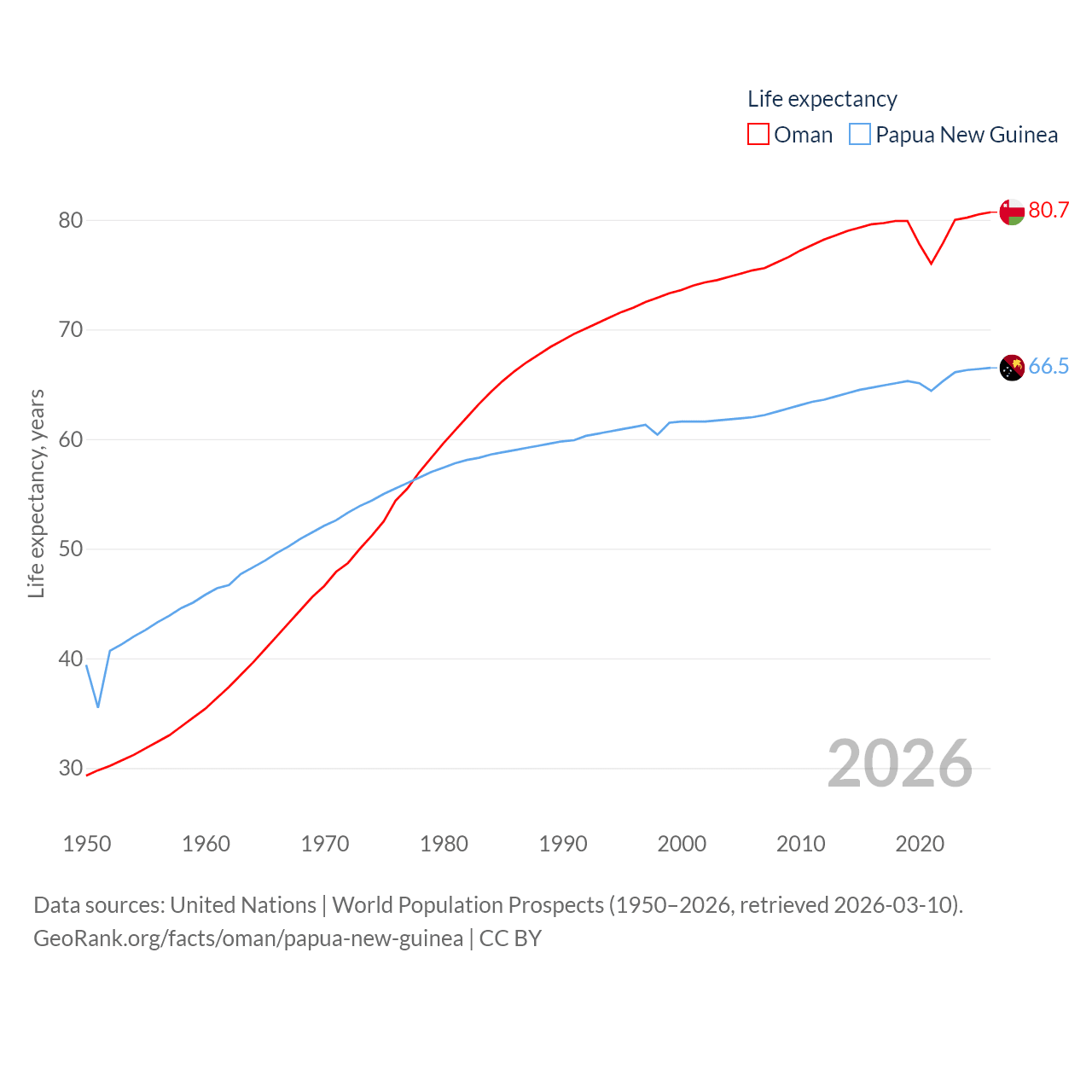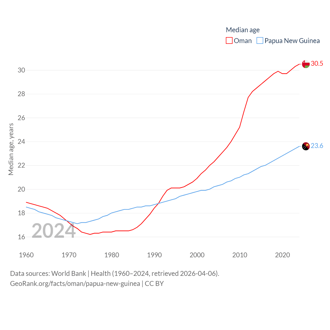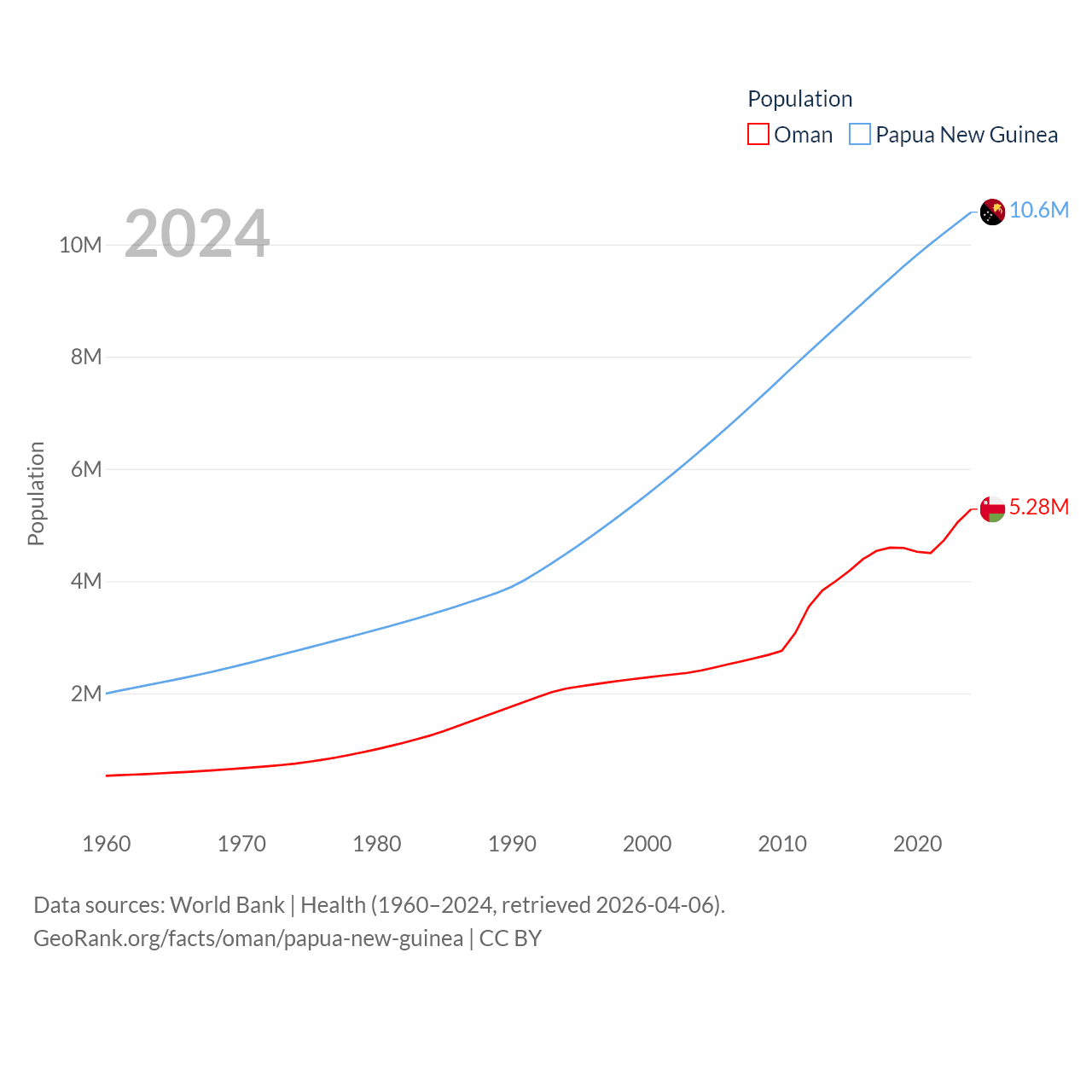 Oman has a population of 5.28M (ranked 124/197), compared with 10.6M in Papua New Guinea (ranked 92/197). Oman's land area is 119,499 sq mi versus 174,850 sq mi for Papua New Guinea (ranked 68th vs. 54th).