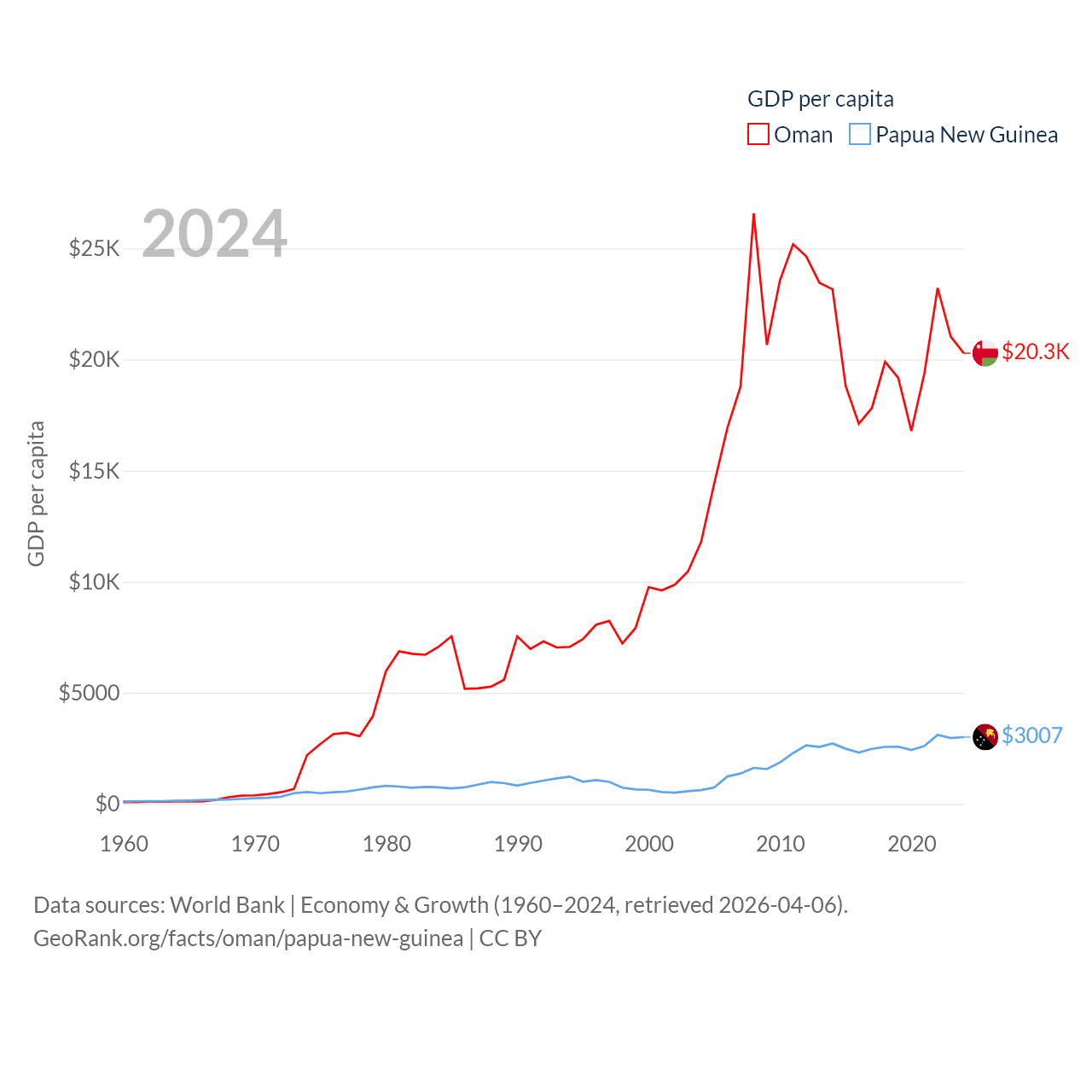 By GDP, Oman ranks 70/197 ($107B) and Papua New Guinea ranks 110/197 ($31.8B). By GDP per capita, Oman ranks 57/197 ($20,285), while Papua New Guinea ranks 140/197 ($3,007).