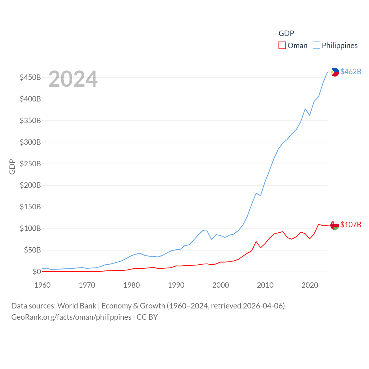 By GDP, Oman ranks 70/197 ($107B) and The Philippines ranks 35/197 ($462B). By GDP per capita, Oman ranks 57/197 ($20,285), while The Philippines ranks 130/197 ($3,985).