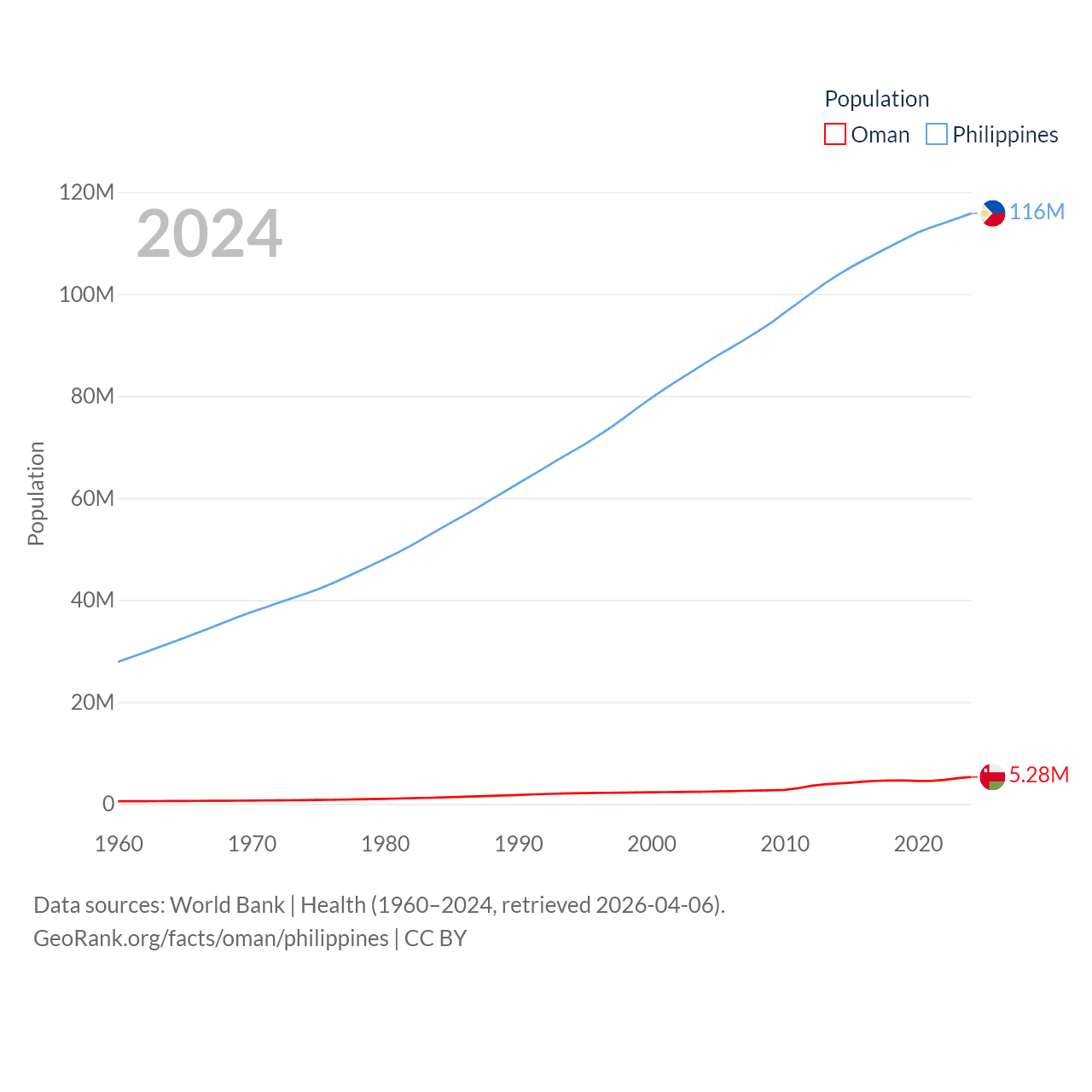 Oman has a population of 5.28M (ranked 124/197), compared with 116M in The Philippines (ranked 14/197). Oman's land area is 119,499 sq mi versus 115,124 sq mi for The Philippines (ranked 68th vs. 71st).