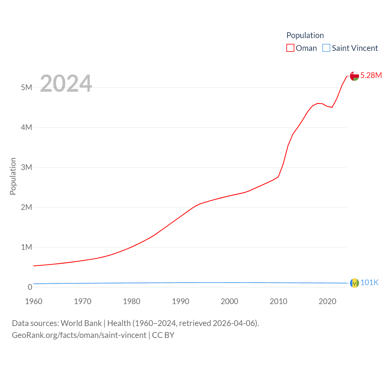 Oman has a population of 5.28M (ranked 124/197), compared with 101K in Saint Vincent (ranked 184/197). Oman's land area is 119,499 sq mi versus 150.6 sq mi for Saint Vincent (ranked 68th vs. 185th).