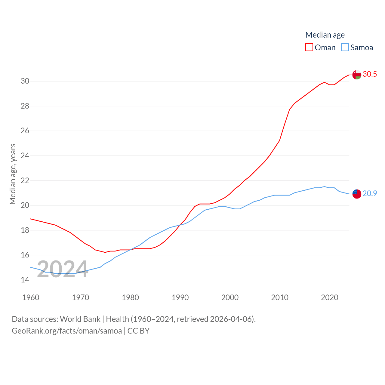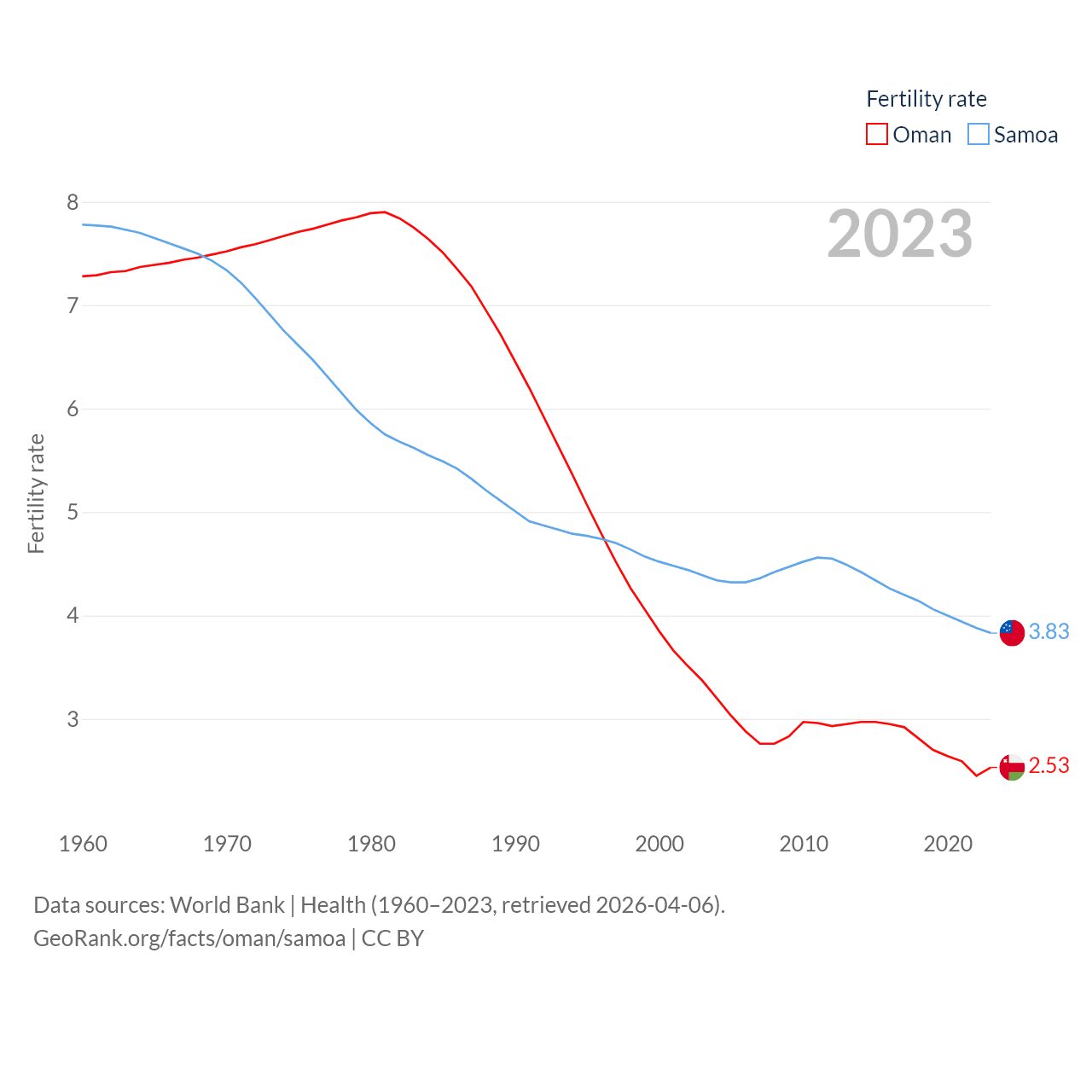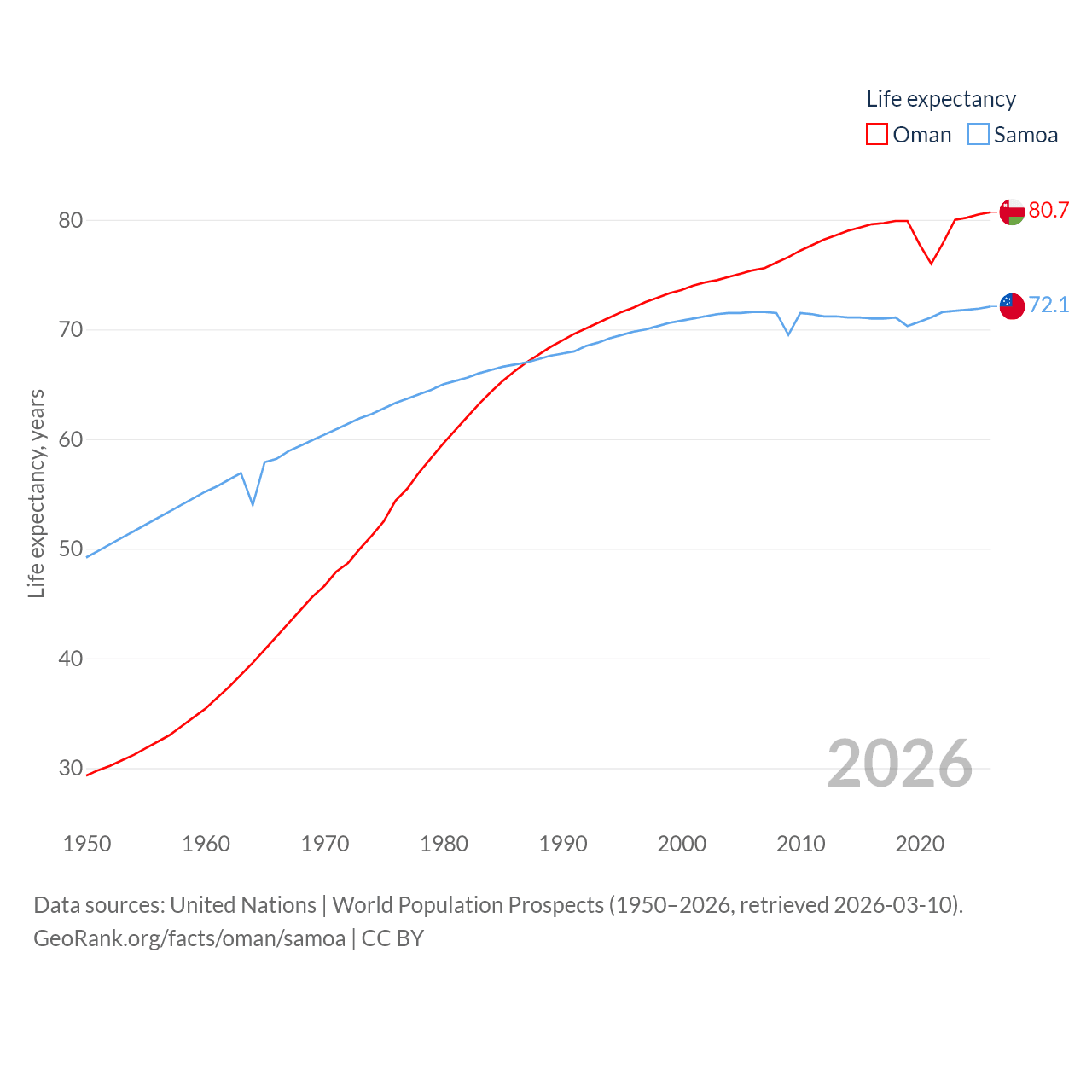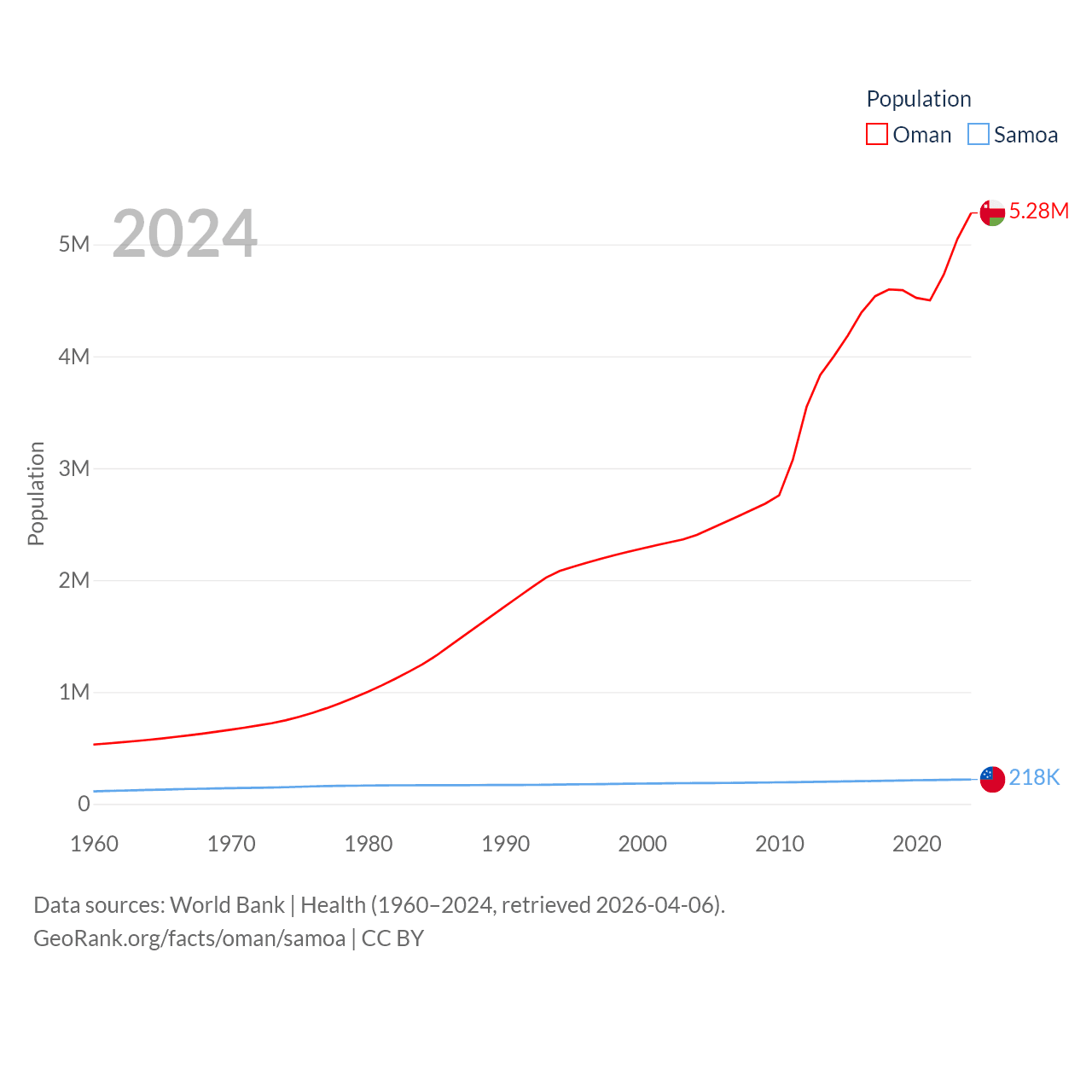 Oman has a population of 5.28M (ranked 124/197), compared with 218K in Samoa (ranked 177/197). Oman's land area is 119,499 sq mi versus 1,073 sq mi for Samoa (ranked 68th vs. 168th).