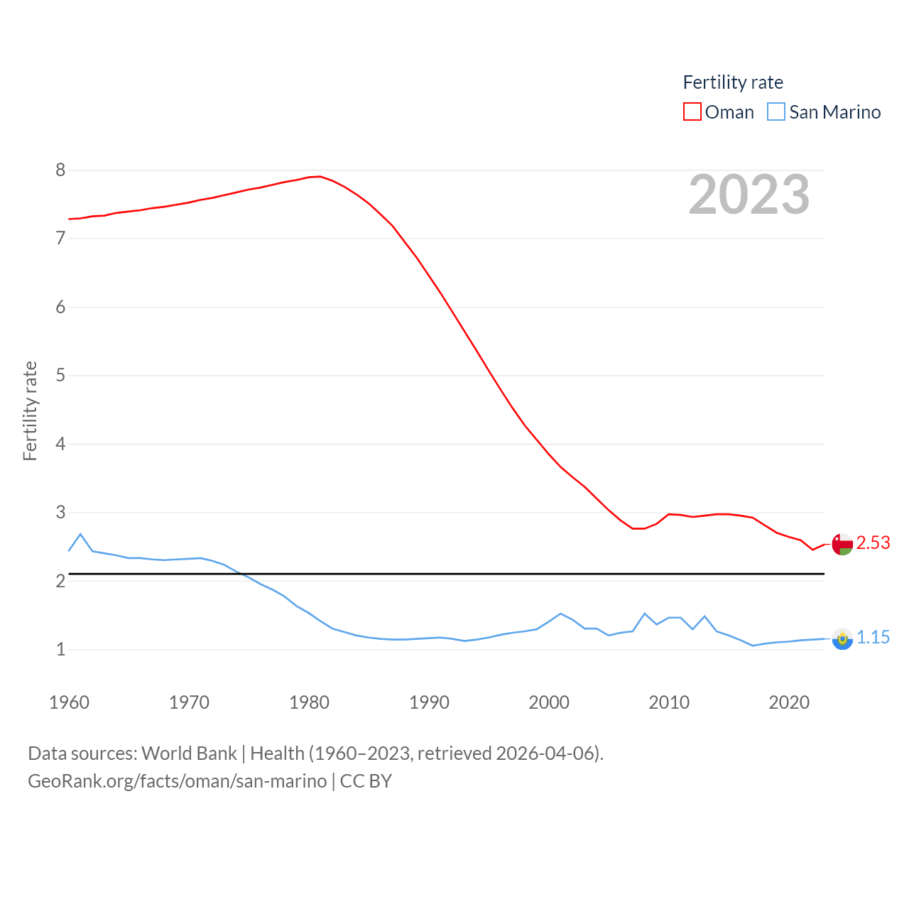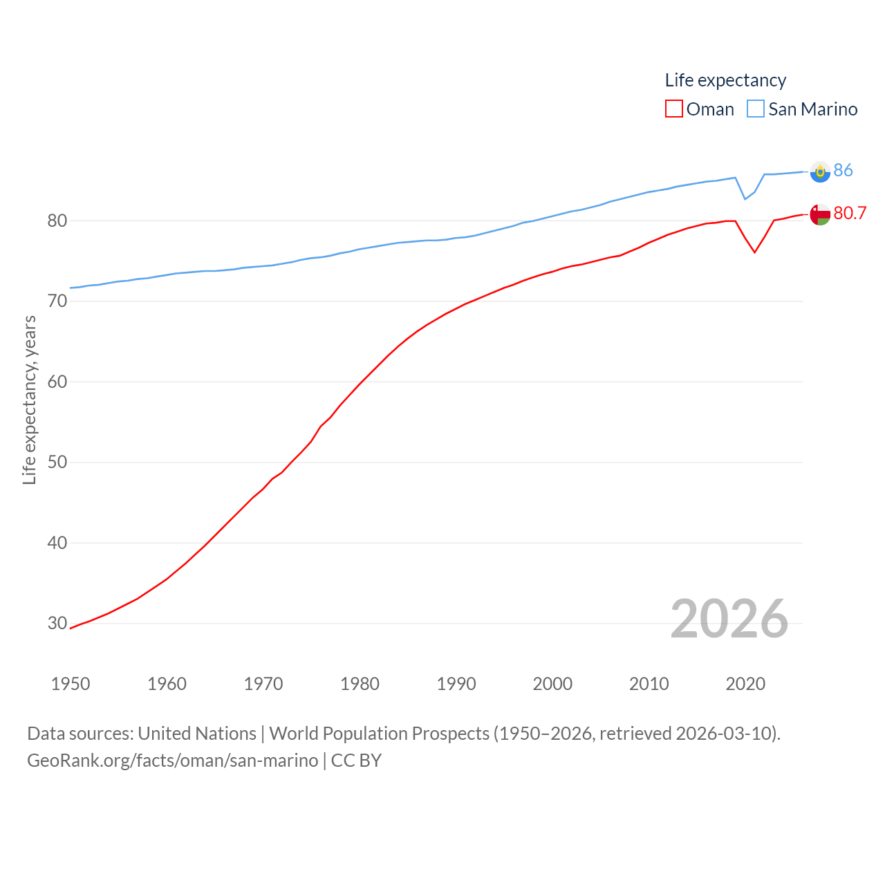 Oman has a population of 5.28M (ranked 124/197), compared with 34K in San Marino (ranked 193/197). Oman's land area is 119,499 sq mi versus 23.2 sq mi for San Marino (ranked 68th vs. 193rd).