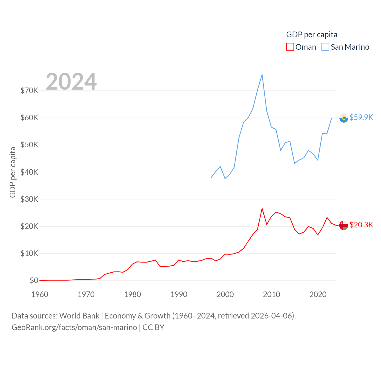 By GDP, Oman ranks 70/197 ($107B) and San Marino ranks 180/197 ($2.03B). By GDP per capita, Oman ranks 57/197 ($20,285), while San Marino ranks 15/197 ($59,880).