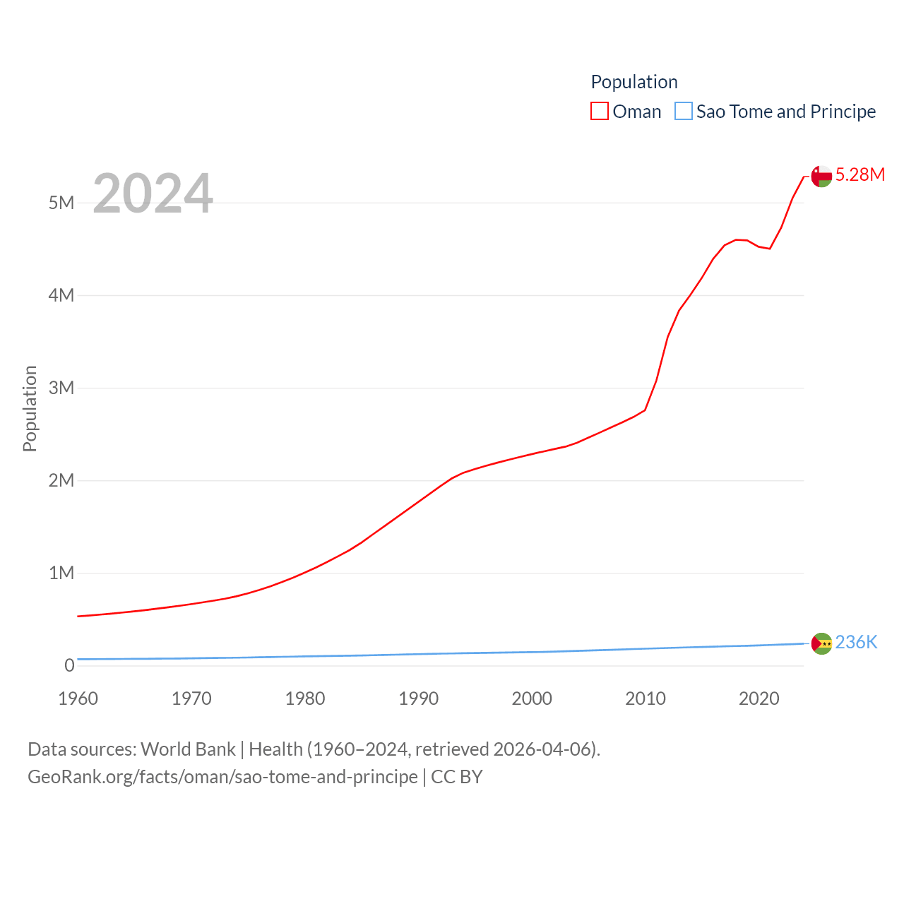 Oman has a population of 5.28M (ranked 124/197), compared with 236K in Sao Tome and Principe (ranked 176/197). Oman's land area is 119,499 sq mi versus 371 sq mi for Sao Tome and Principe (ranked 68th vs. 172nd).