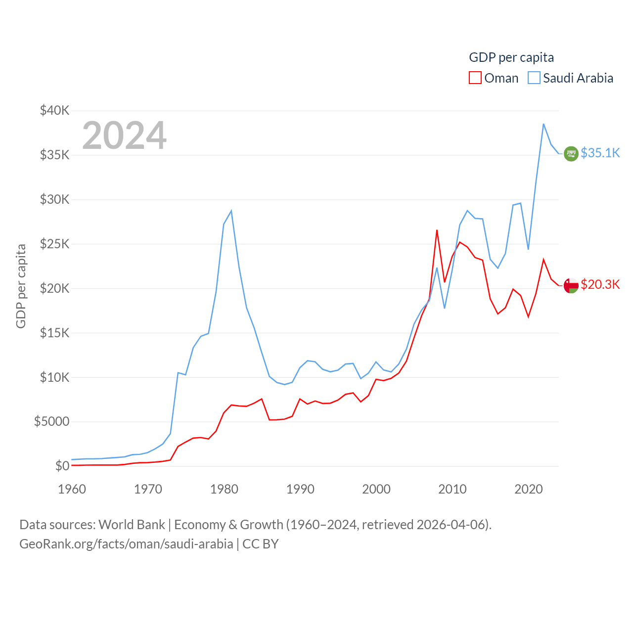 By GDP, Oman ranks 70/197 ($107B) and Saudi Arabia ranks 18/197 ($1.24T). By GDP per capita, Oman ranks 57/197 ($20,285), while Saudi Arabia ranks 33/197 ($35,122).