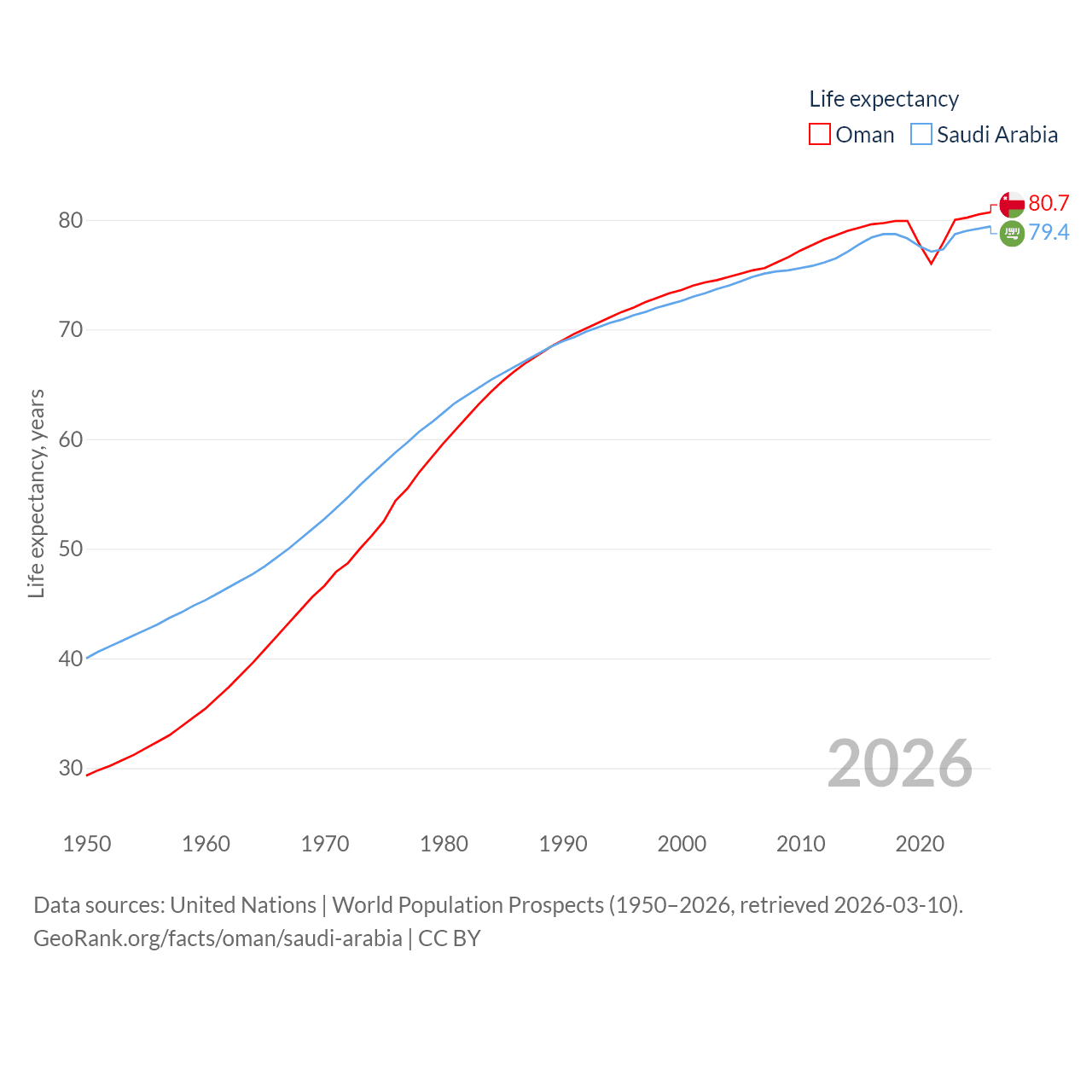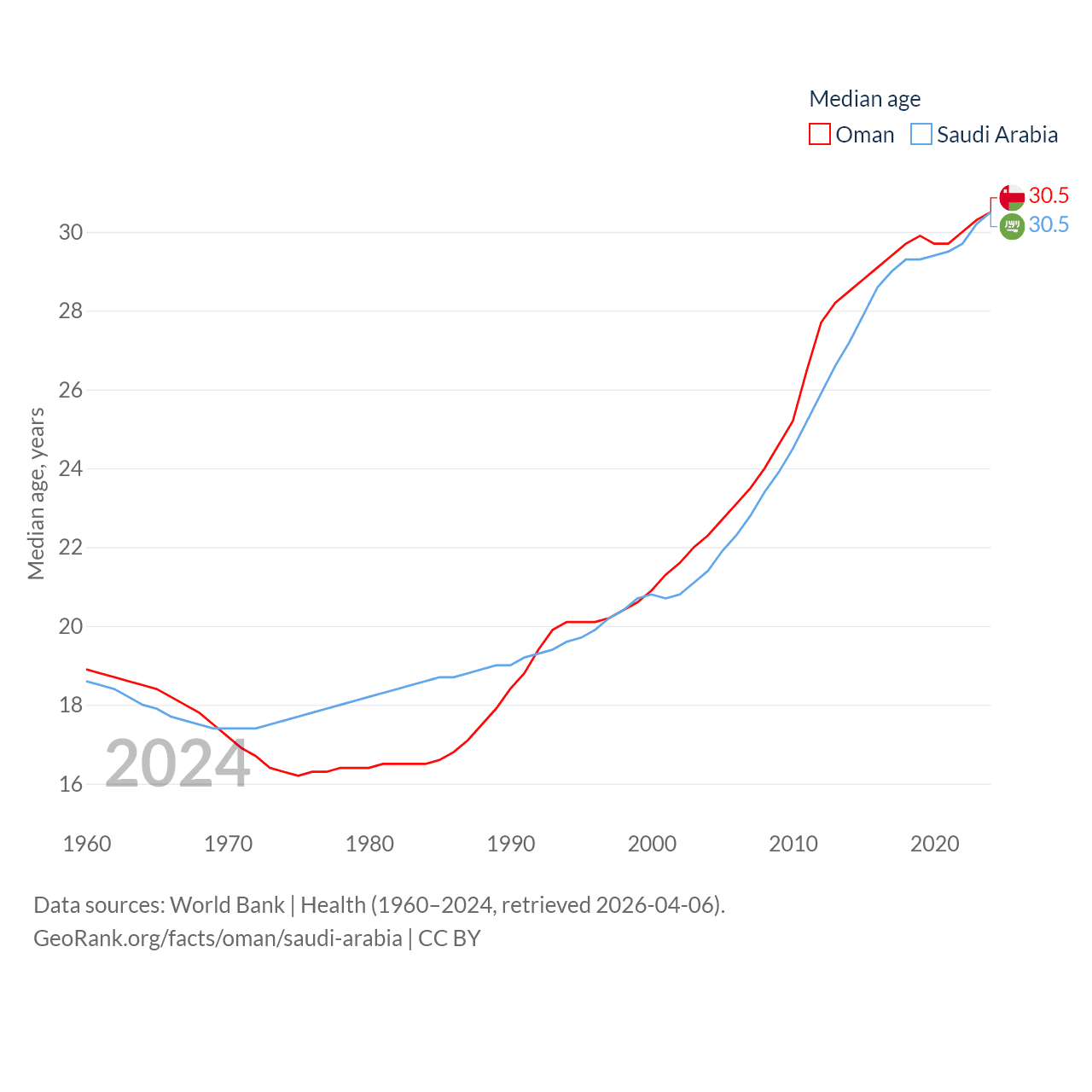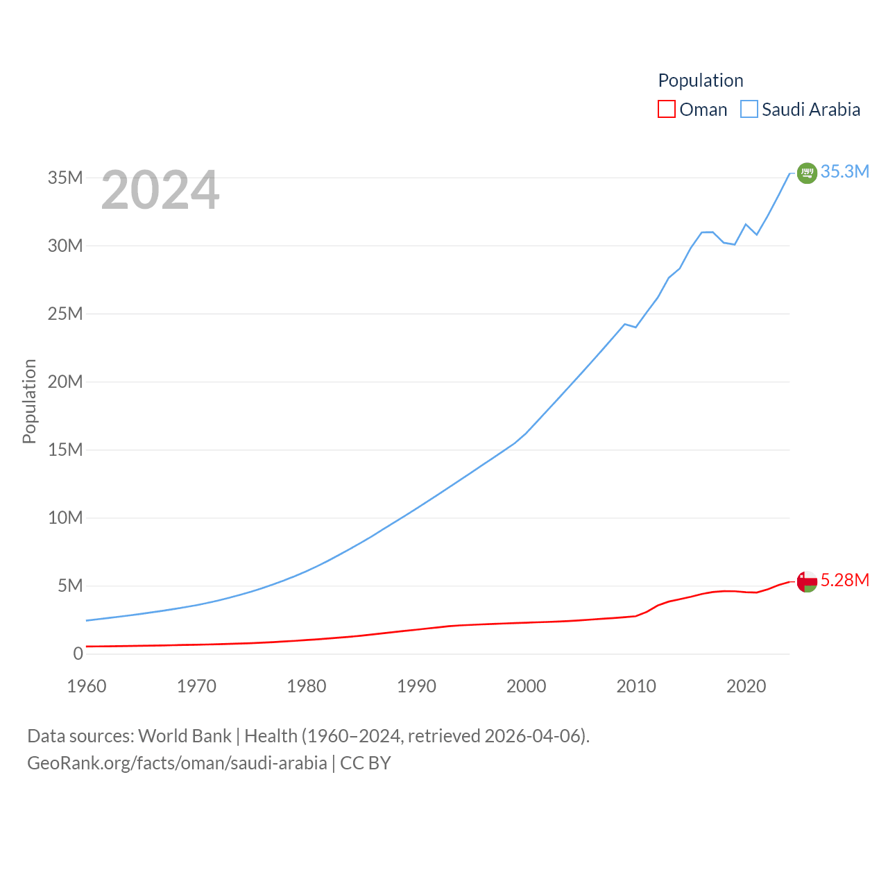 Oman has a population of 5.28M (ranked 124/197), compared with 35.3M in Saudi Arabia (ranked 45/197). Oman's land area is 119,499 sq mi versus 830,000 sq mi for Saudi Arabia (ranked 68th vs. 12th).