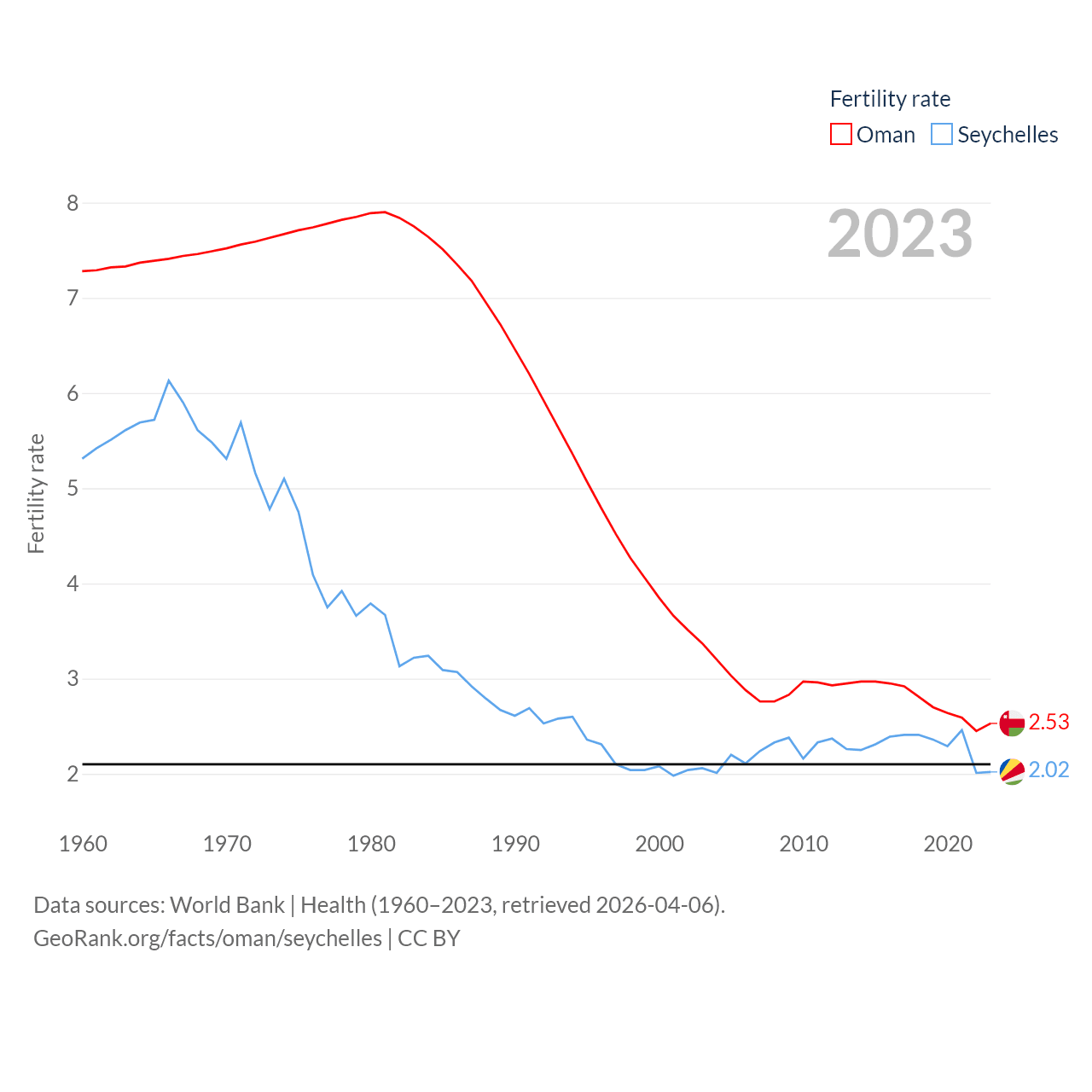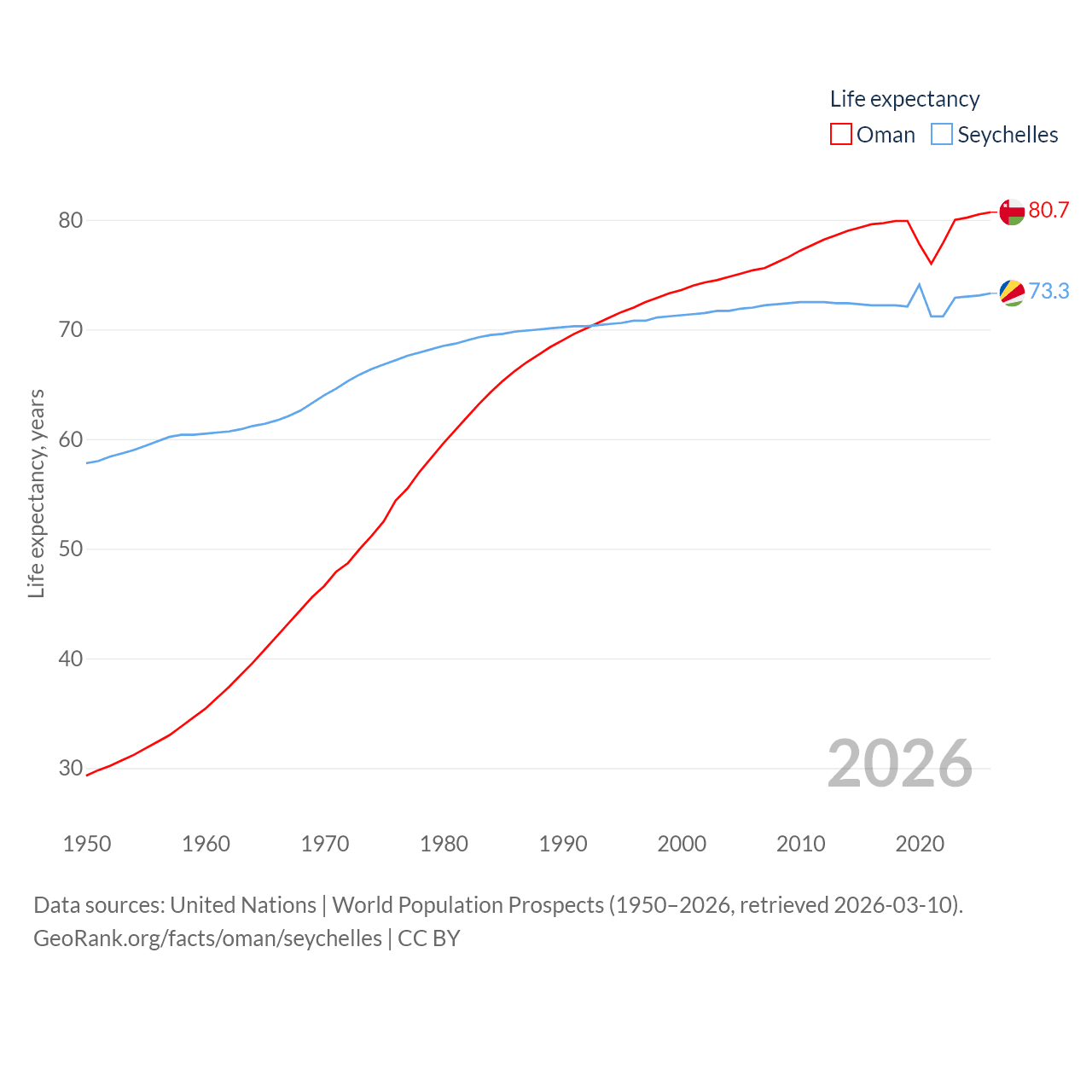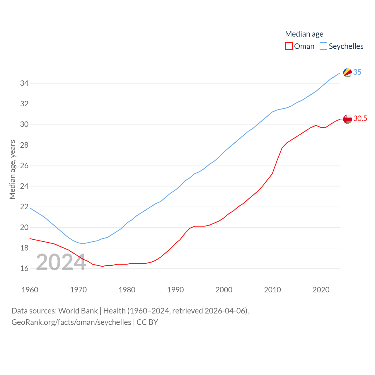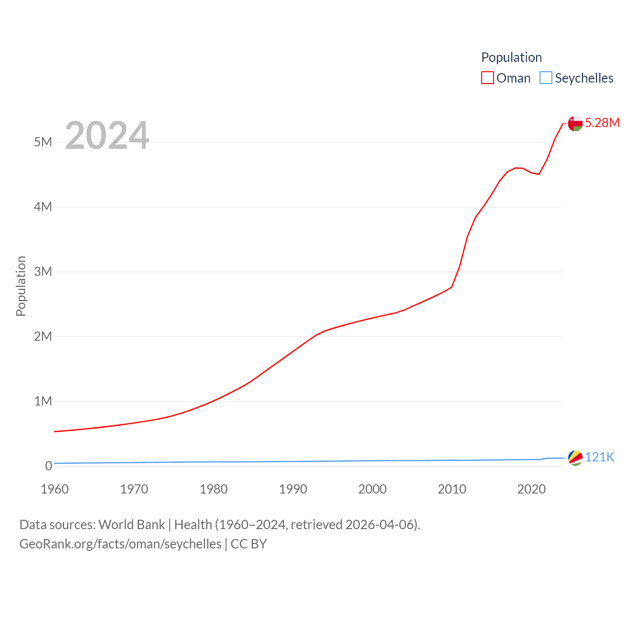 Oman has a population of 5.28M (ranked 124/197), compared with 121K in The Seychelles (ranked 181/197). Oman's land area is 119,499 sq mi versus 177.6 sq mi for The Seychelles (ranked 68th vs. 181st).