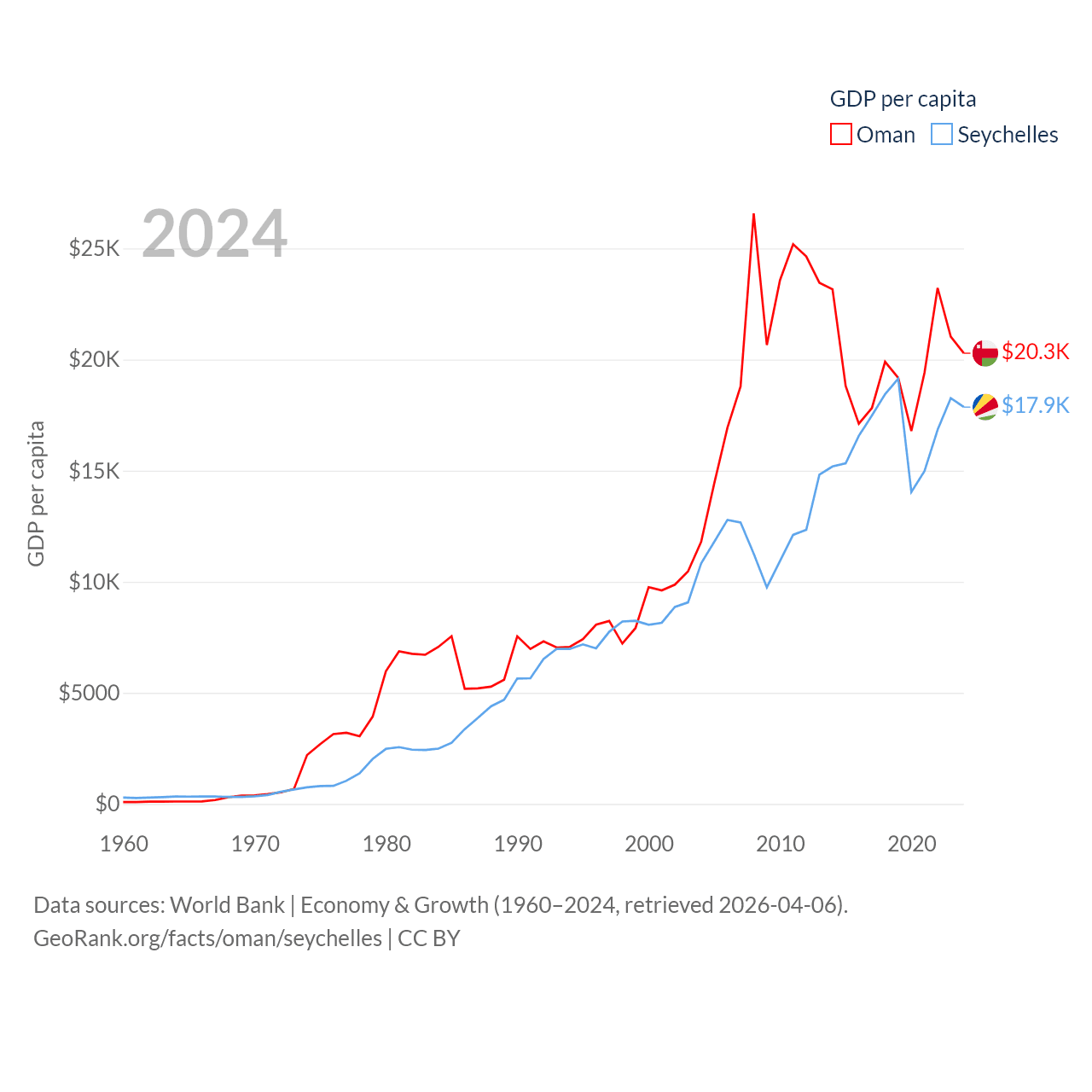 By GDP, Oman ranks 70/197 ($107B) and The Seychelles ranks 178/197 ($2.17B). By GDP per capita, Oman ranks 57/197 ($20,285), while The Seychelles ranks 63/197 ($17,859).