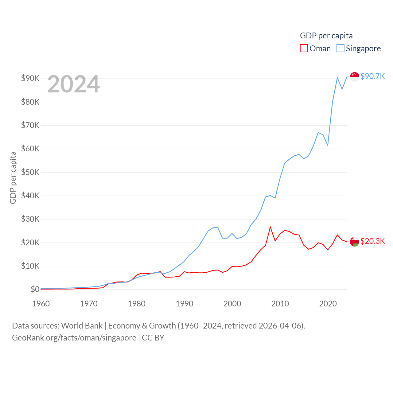 By GDP, Oman ranks 70/197 ($107B) and Singapore ranks 28/197 ($547B). By GDP per capita, Oman ranks 57/197 ($20,285), while Singapore ranks 7/197 ($90,674).