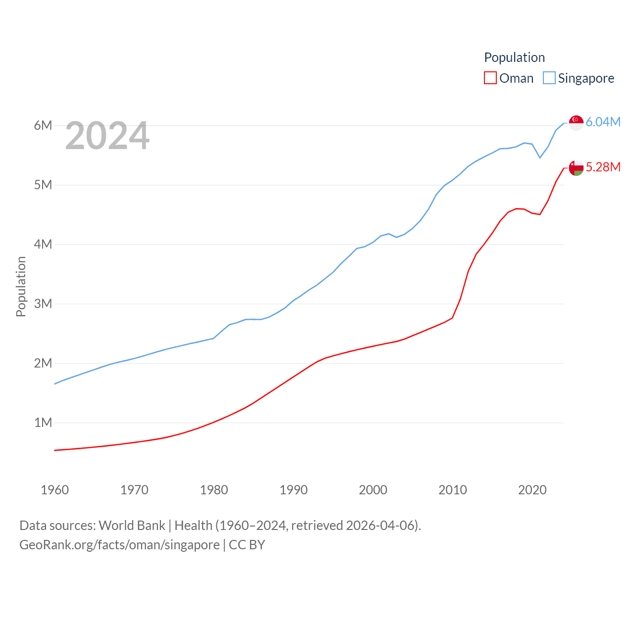 Oman has a population of 5.28M (ranked 124/197), compared with 6.04M in Singapore (ranked 113/197). Oman's land area is 119,499 sq mi versus 277.2 sq mi for Singapore (ranked 68th vs. 177th).