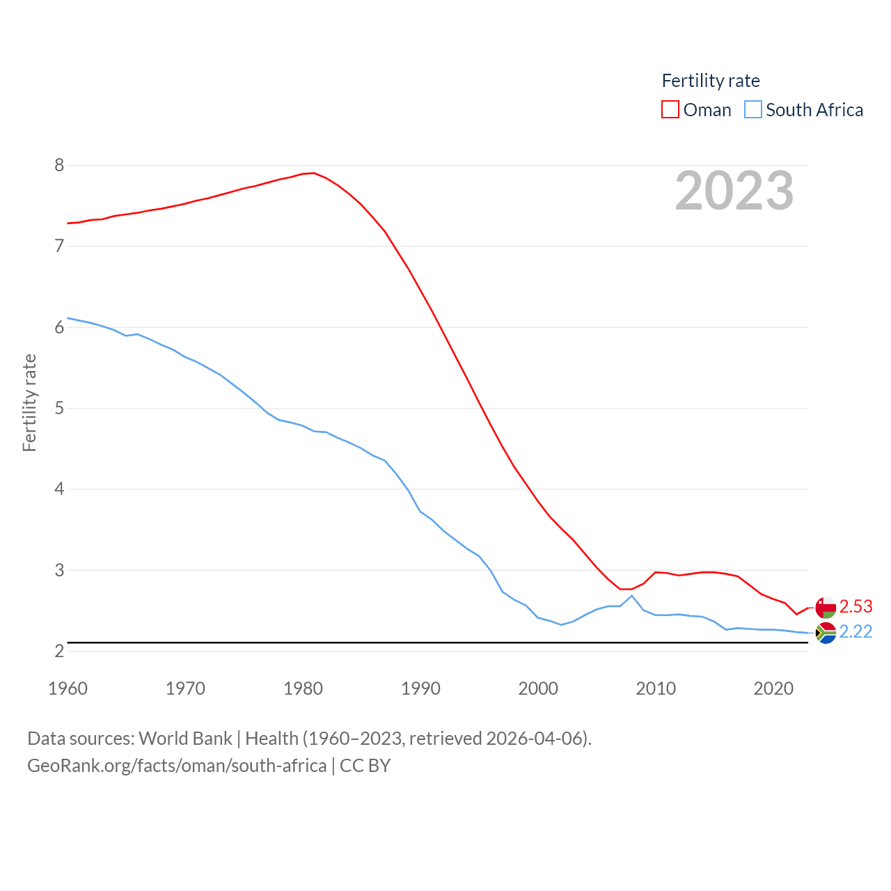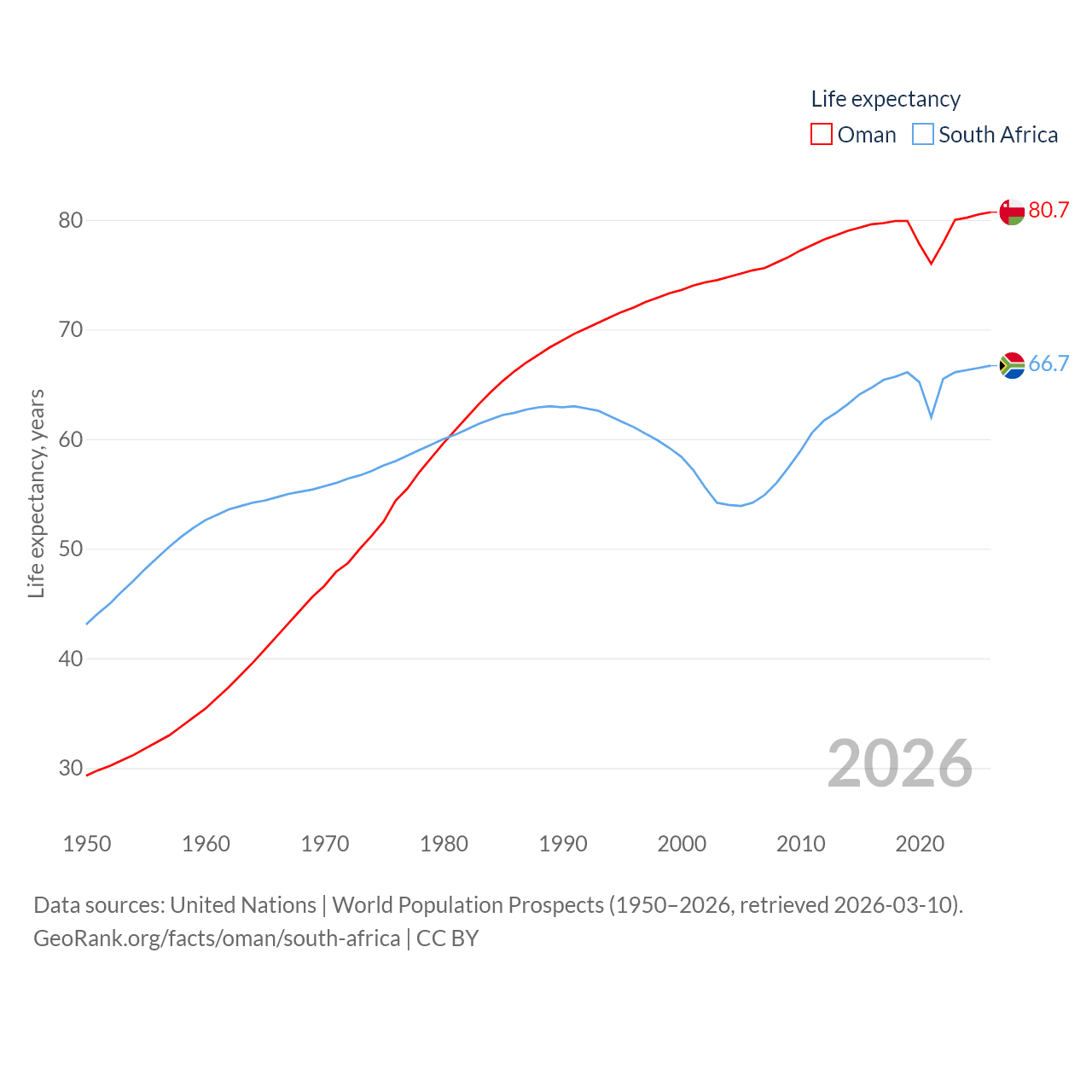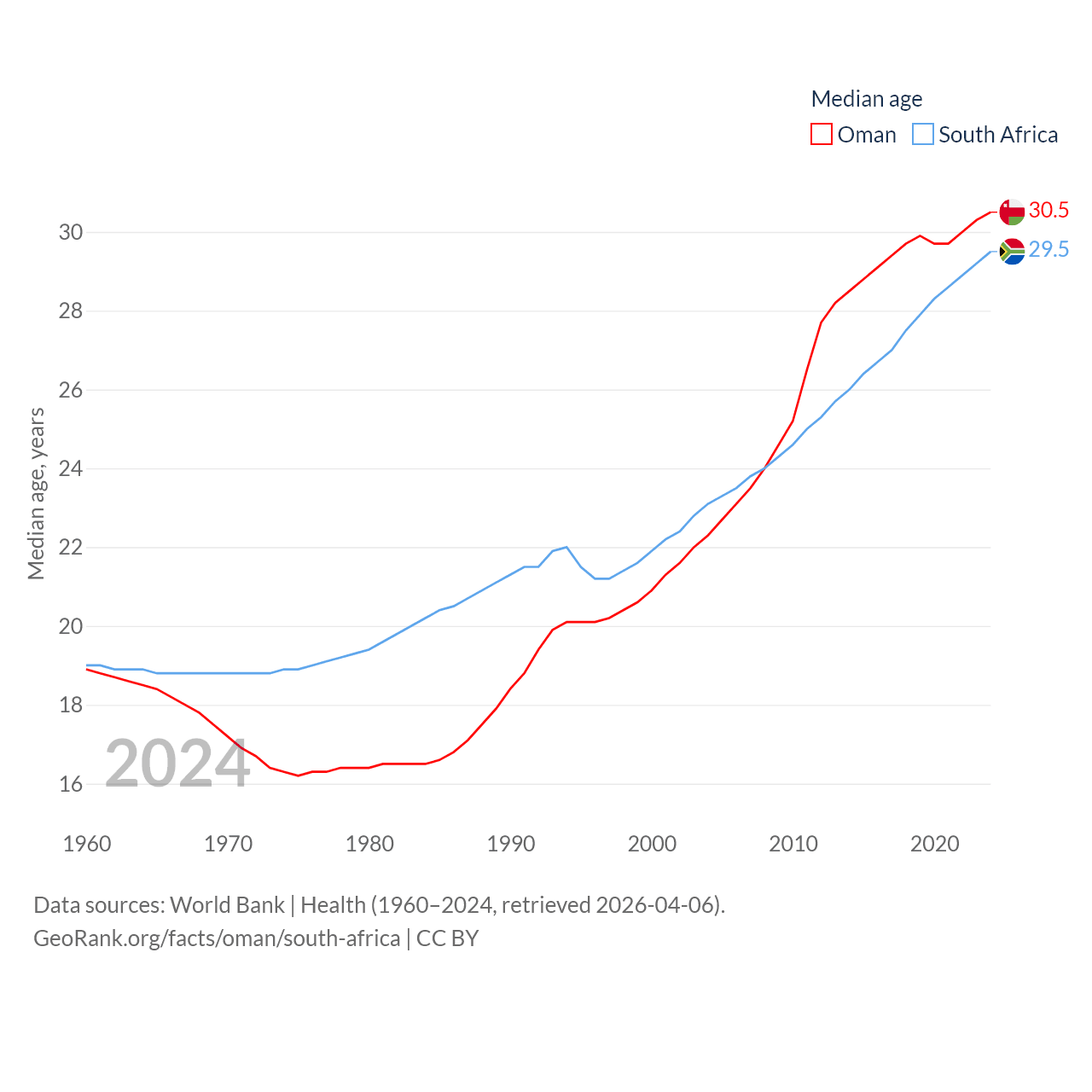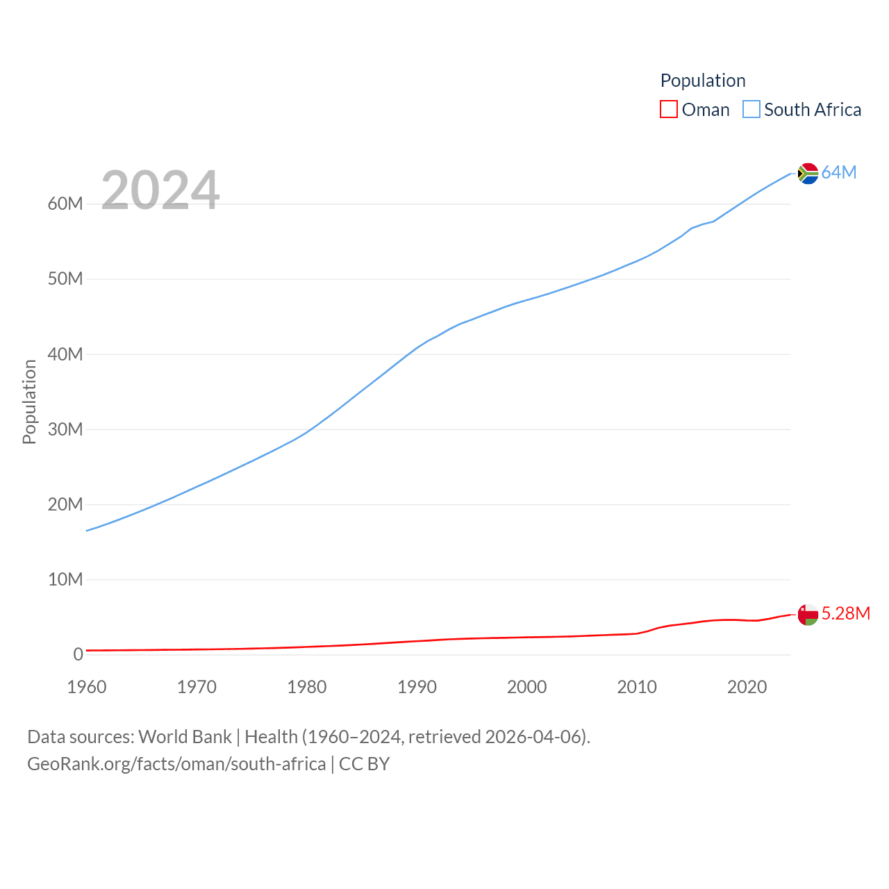 Oman has a population of 5.28M (ranked 124/197), compared with 64M in South Africa (ranked 24/197). Oman's land area is 119,499 sq mi versus 468,377 sq mi for South Africa (ranked 68th vs. 24th).