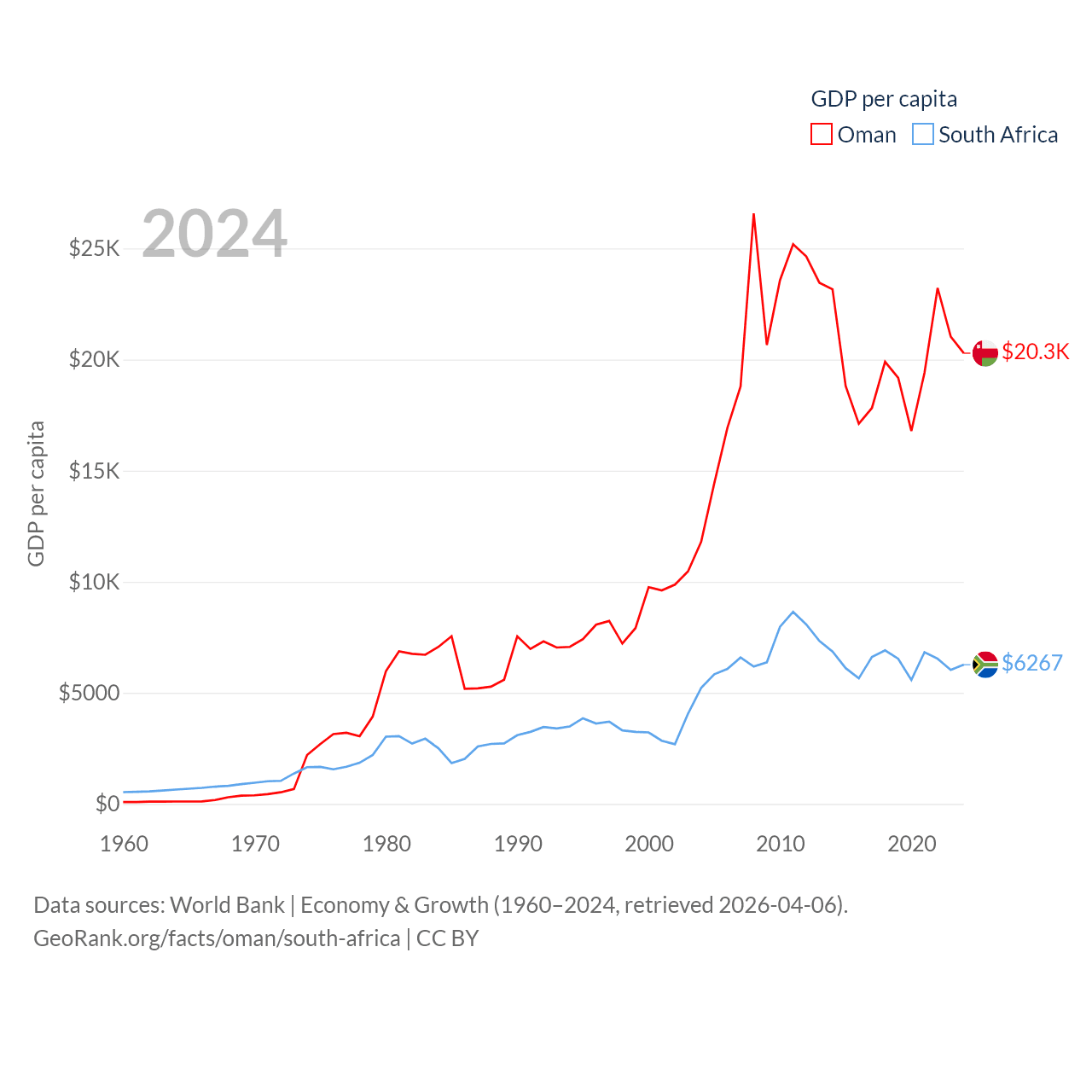 By GDP, Oman ranks 70/197 ($107B) and South Africa ranks 40/197 ($401B). By GDP per capita, Oman ranks 57/197 ($20,285), while South Africa ranks 111/197 ($6,267).