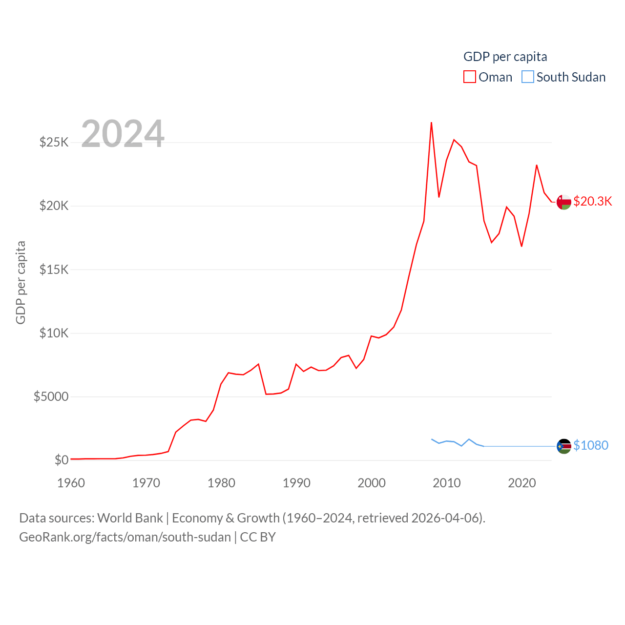 By GDP, Oman ranks 70/197 ($107B) and South Sudan ranks 149/197 ($12B). By GDP per capita, Oman ranks 57/197 ($20,285), while South Sudan ranks 175/197 ($1,080).