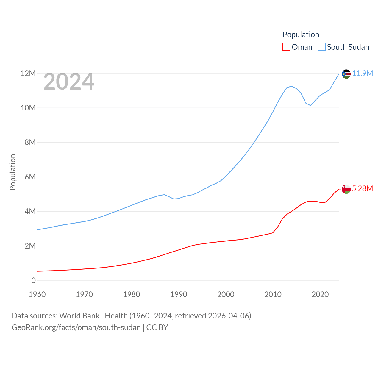 Oman has a population of 5.28M (ranked 124/197), compared with 11.9M in South Sudan (ranked 81/197). Oman's land area is 119,499 sq mi versus 243,990 sq mi for South Sudan (ranked 68th vs. 41st).