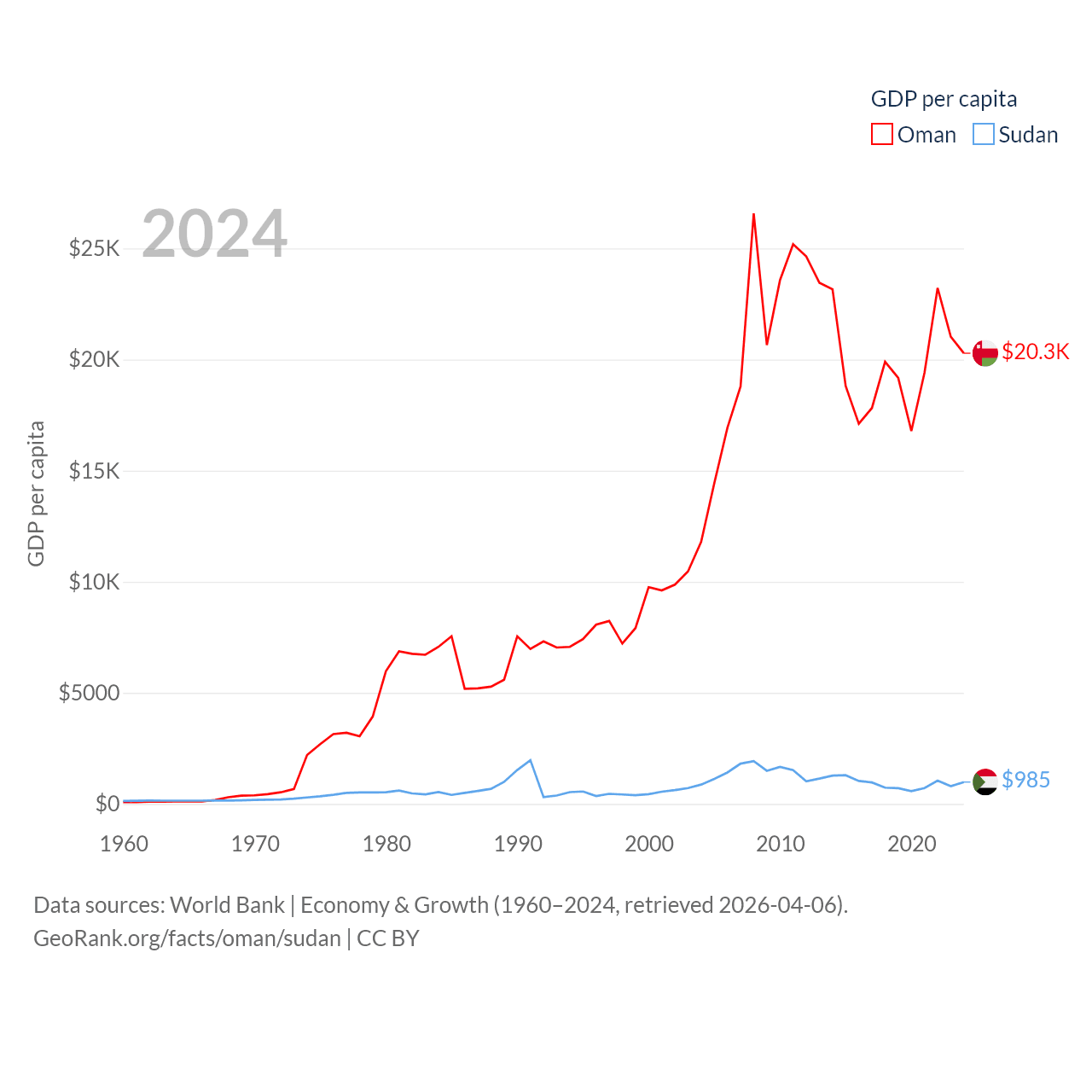 By GDP, Oman ranks 70/197 ($107B) and Sudan ranks 94/197 ($49.7B). By GDP per capita, Oman ranks 57/197 ($20,285), while Sudan ranks 179/197 ($985).