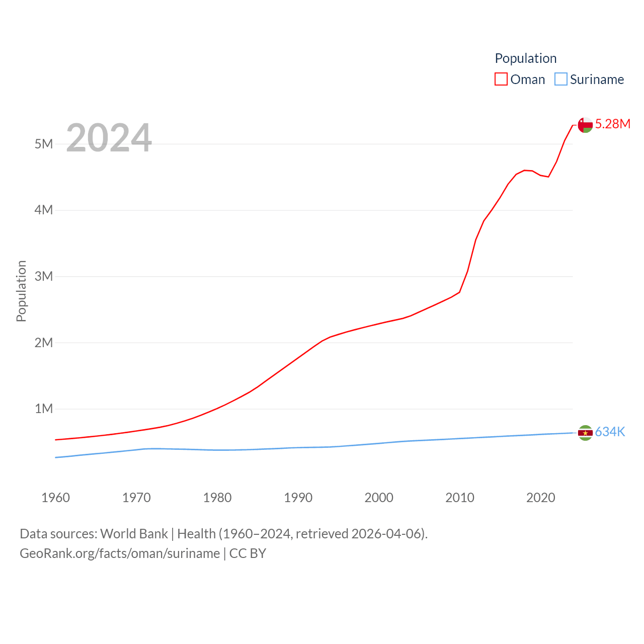 Oman has a population of 5.28M (ranked 124/197), compared with 634K in Suriname (ranked 165/197). Oman's land area is 119,499 sq mi versus 61,972 sq mi for Suriname (ranked 68th vs. 90th).