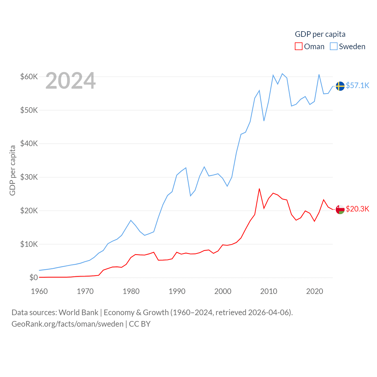 By GDP, Oman ranks 70/197 ($107B) and Sweden ranks 26/197 ($604B). By GDP per capita, Oman ranks 57/197 ($20,285), while Sweden ranks 17/197 ($57,117).