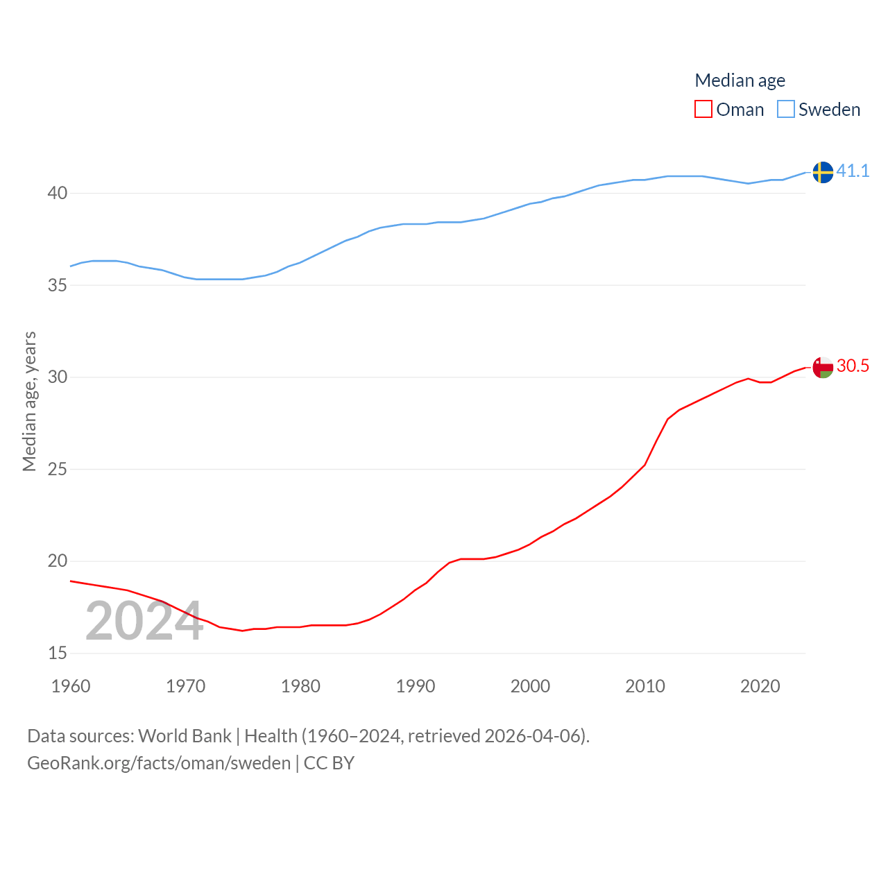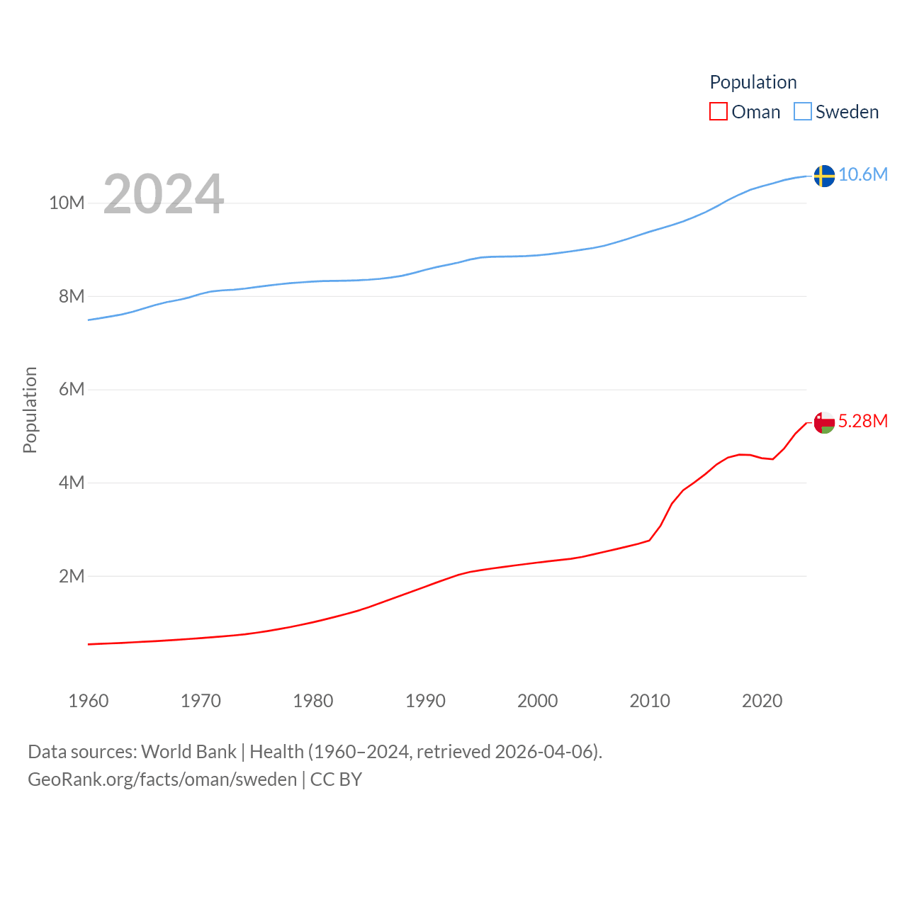 Oman has a population of 5.28M (ranked 124/197), compared with 10.6M in Sweden (ranked 93/197). Oman's land area is 119,499 sq mi versus 157,248 sq mi for Sweden (ranked 68th vs. 58th).