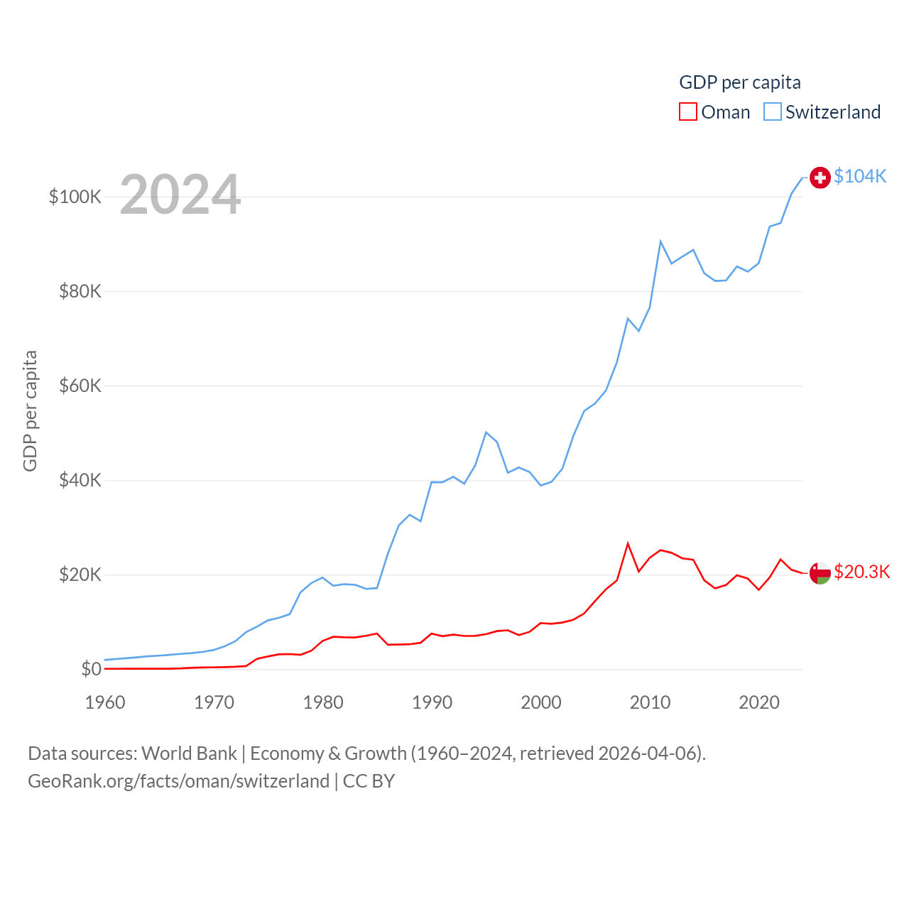 By GDP, Oman ranks 70/197 ($107B) and Switzerland ranks 20/197 ($937B). By GDP per capita, Oman ranks 57/197 ($20,285), while Switzerland ranks 5/197 ($103,998).