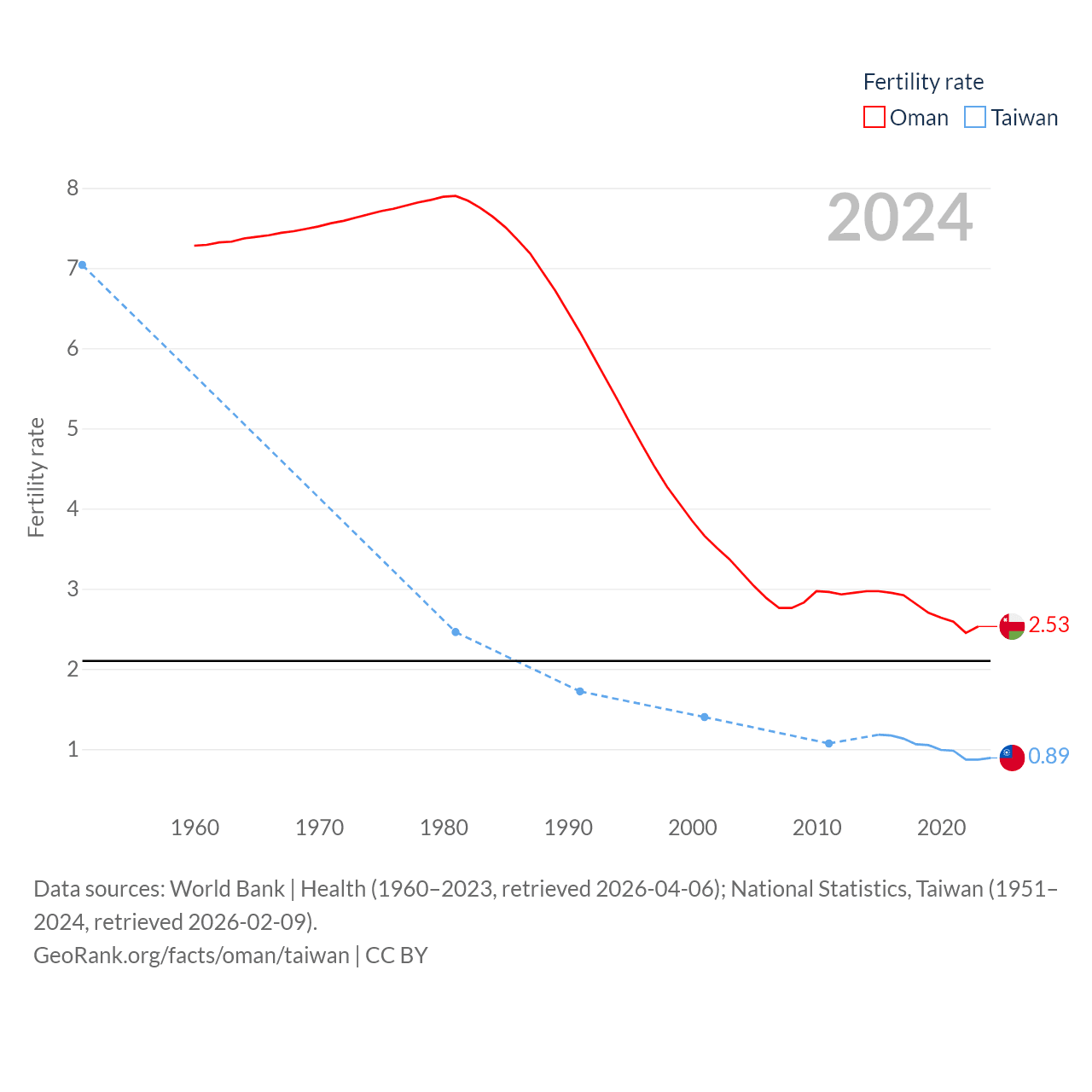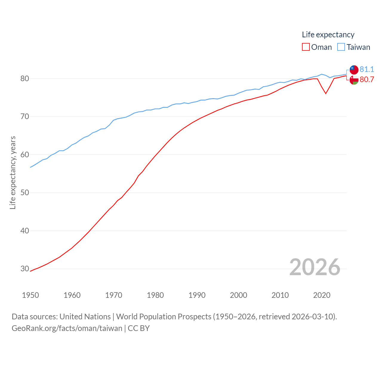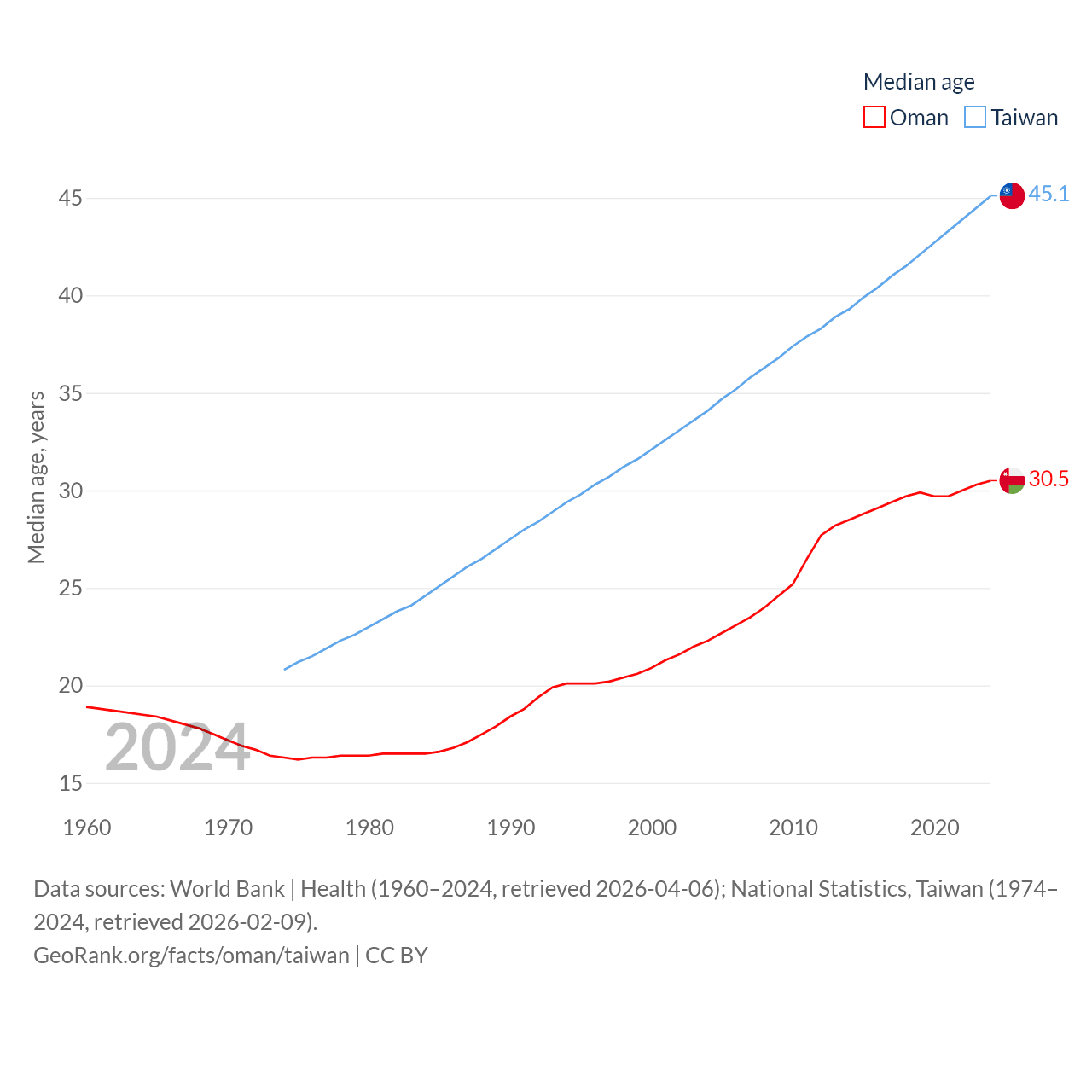 Oman has a population of 5.28M (ranked 124/197), compared with 23.3M in Taiwan (ranked 60/197). Oman's land area is 119,499 sq mi versus 13,976 sq mi for Taiwan (ranked 68th vs. 133rd).
