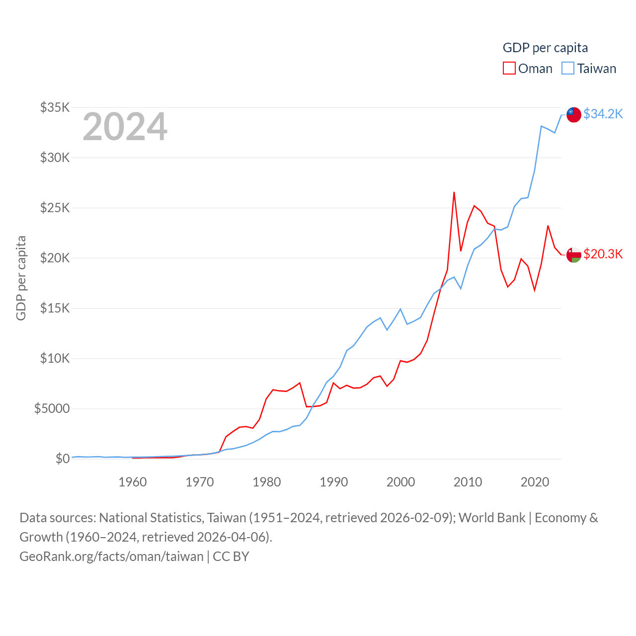 By GDP, Oman ranks 70/197 ($107B) and Taiwan ranks 22/197 ($802B). By GDP per capita, Oman ranks 57/197 ($20,285), while Taiwan ranks 35/197 ($34,238).