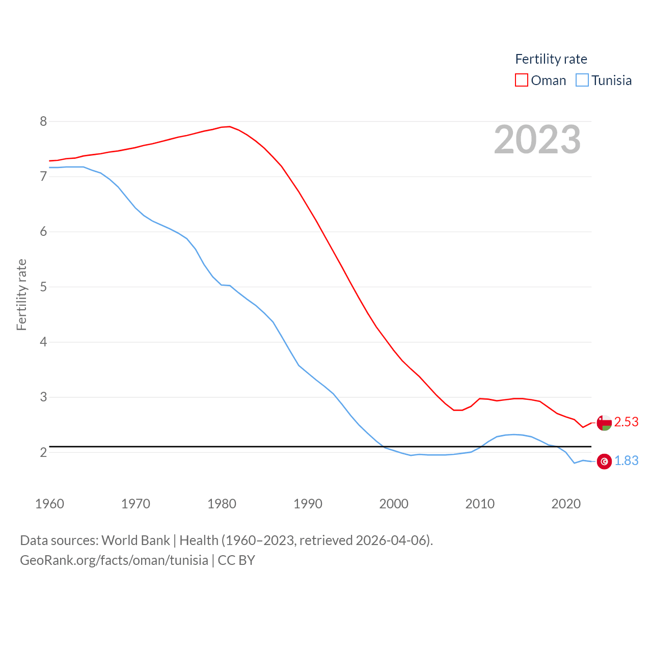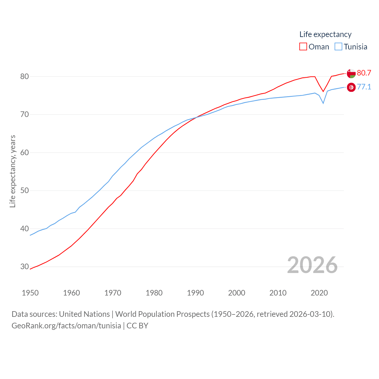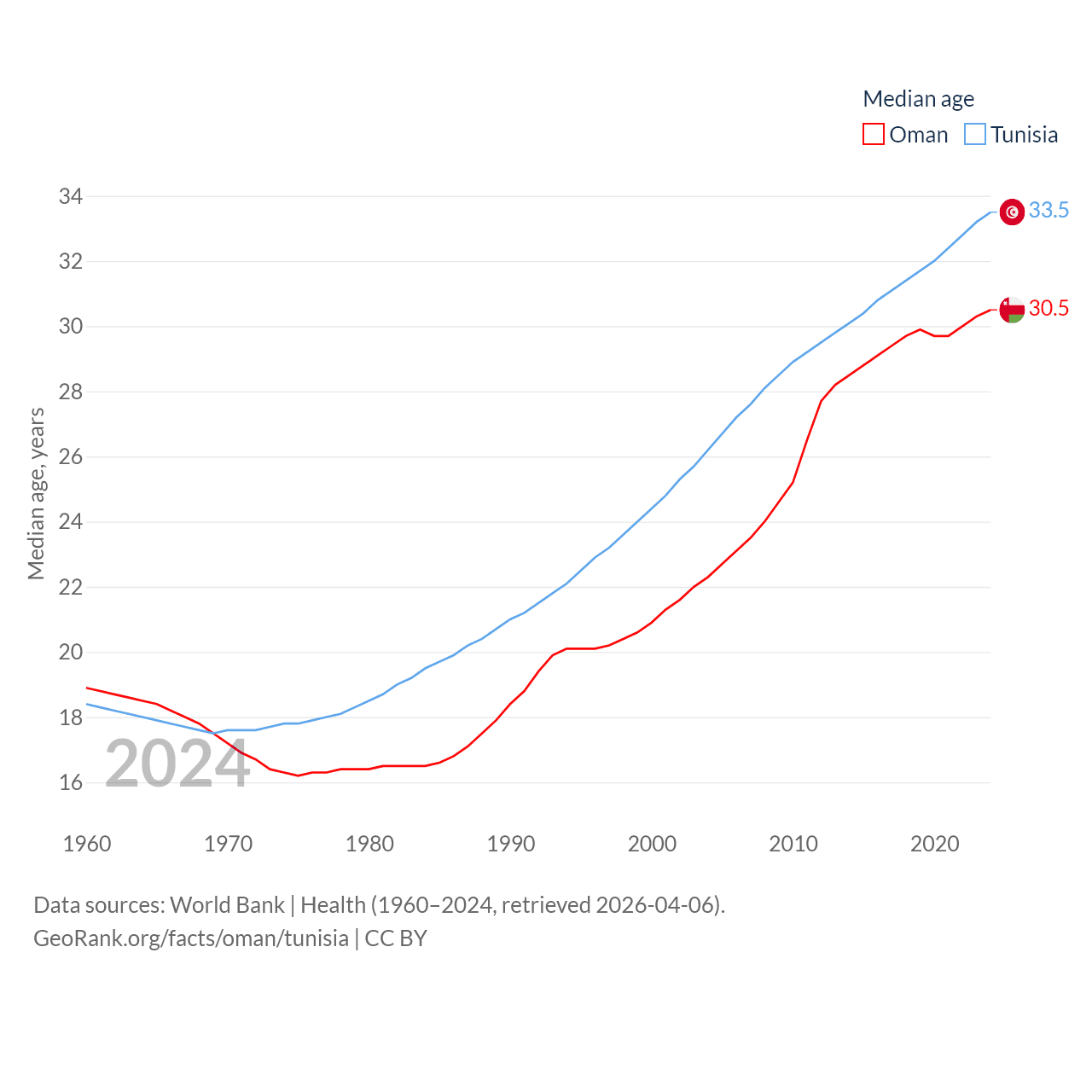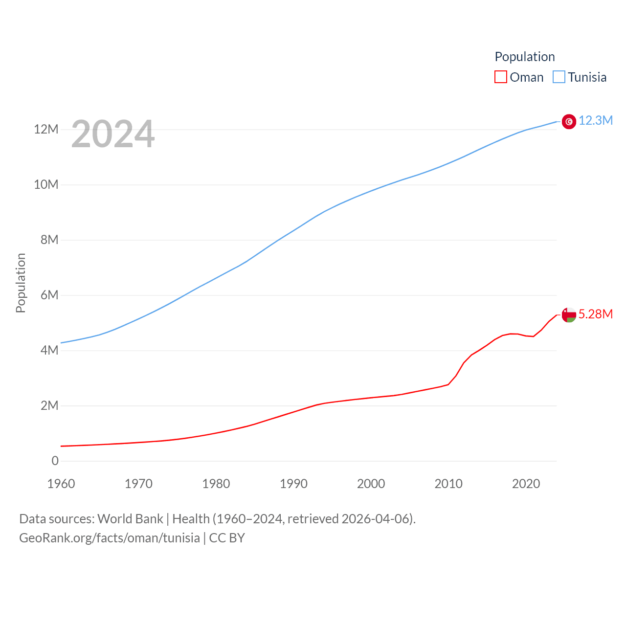 Oman has a population of 5.28M (ranked 124/197), compared with 12.3M in Tunisia (ranked 80/197). Oman's land area is 119,499 sq mi versus 59,985 sq mi for Tunisia (ranked 68th vs. 91st).