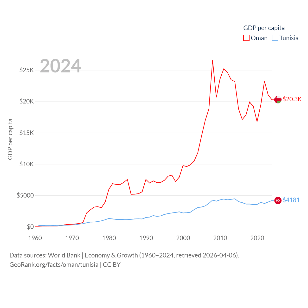 By GDP, Oman ranks 70/197 ($107B) and Tunisia ranks 93/197 ($51.3B). By GDP per capita, Oman ranks 57/197 ($20,285), while Tunisia ranks 129/197 ($4,181).