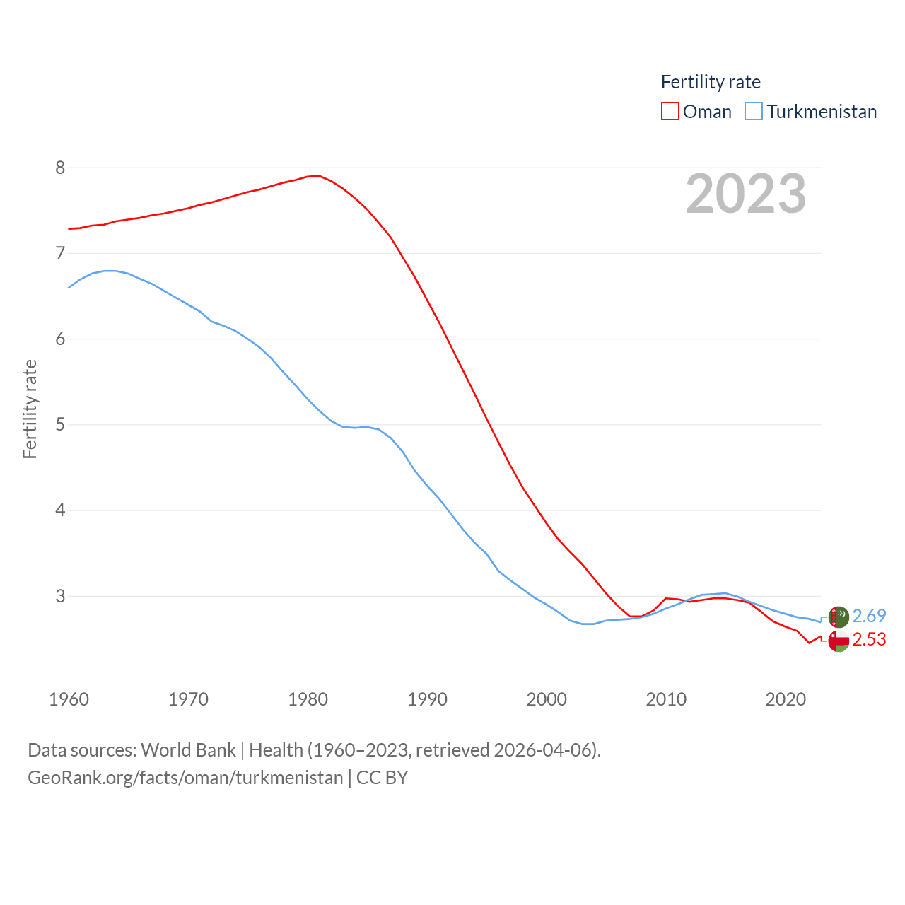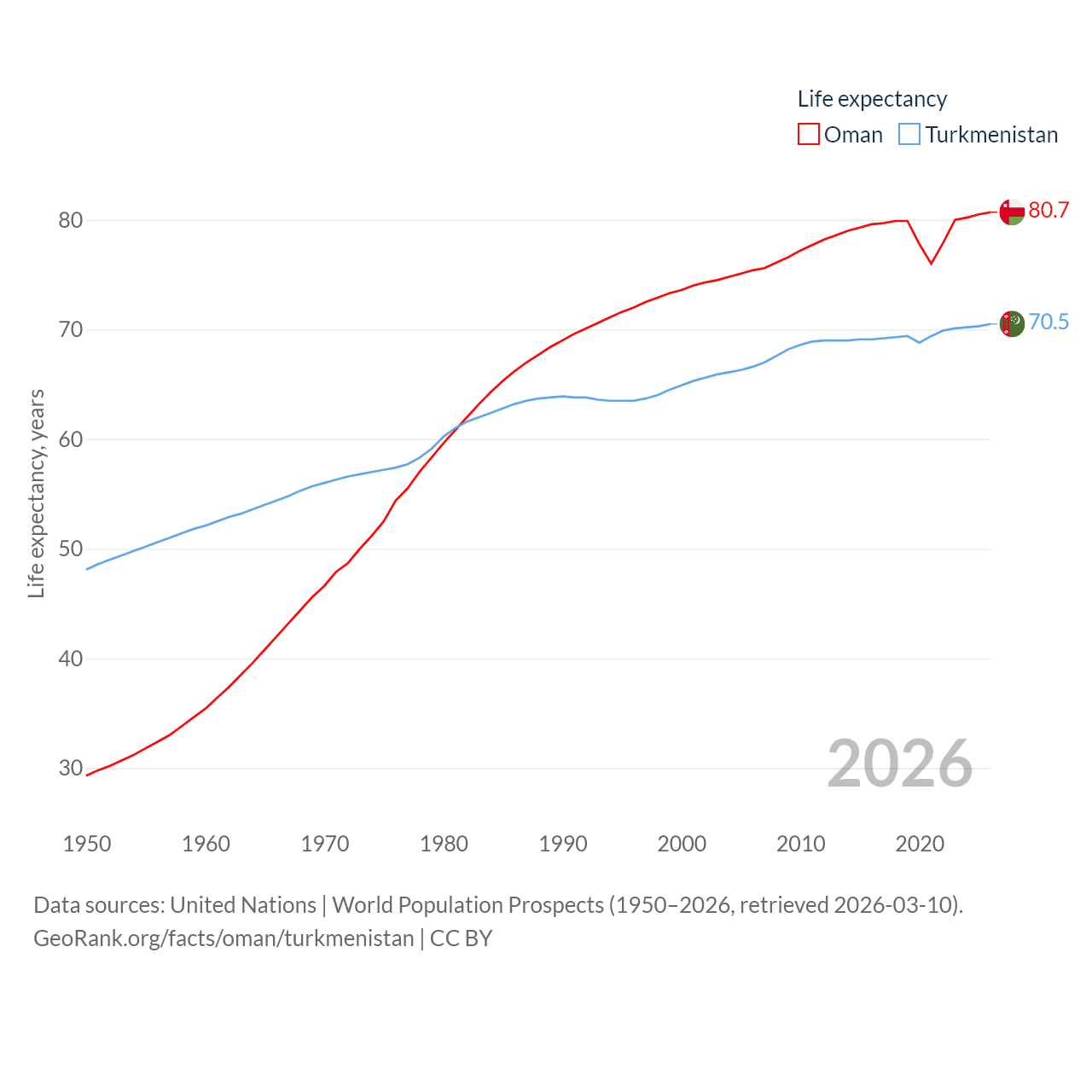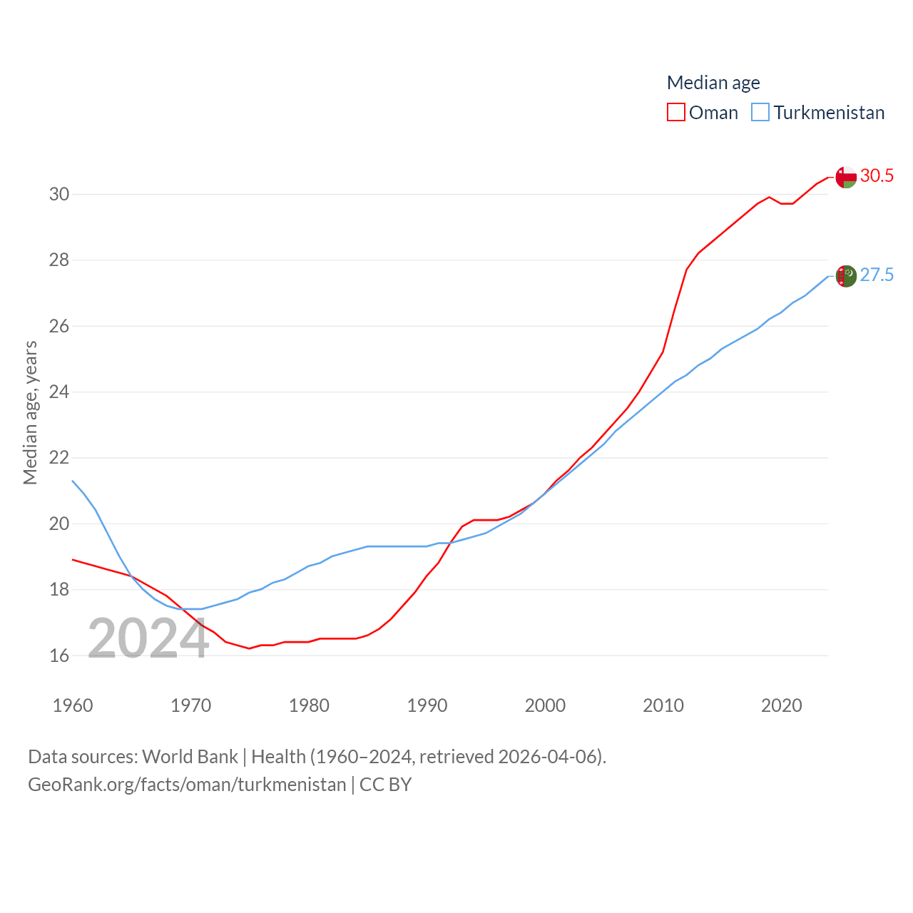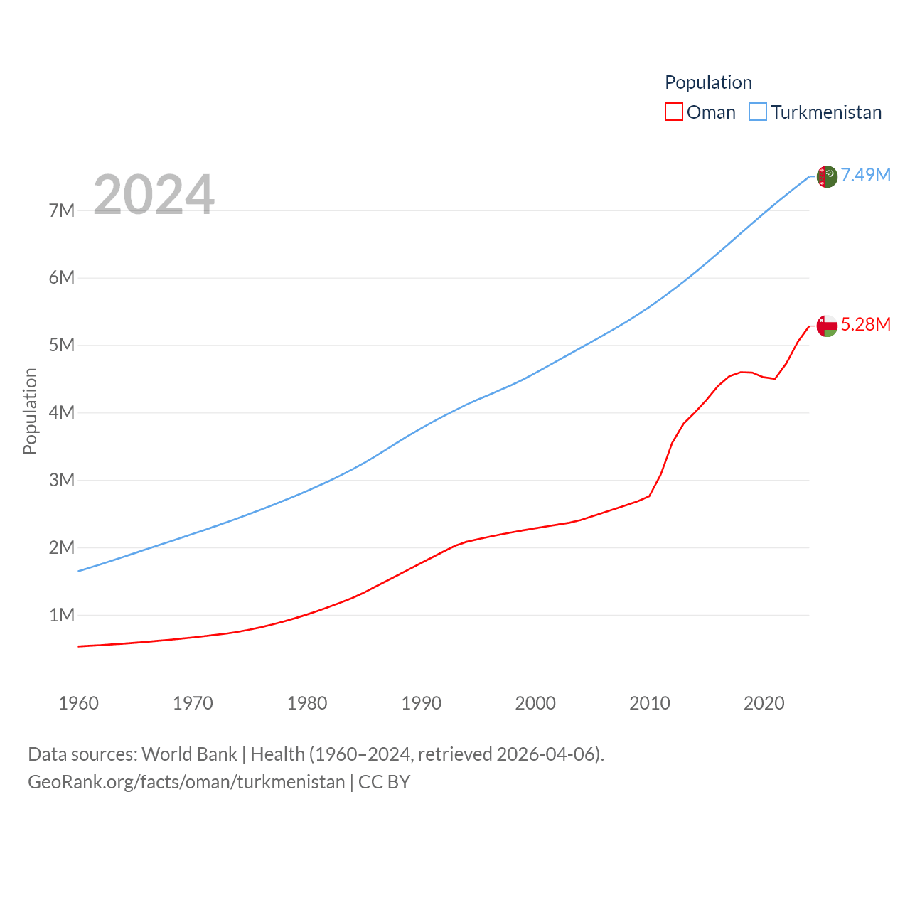 Oman has a population of 5.28M (ranked 124/197), compared with 7.49M in Turkmenistan (ranked 104/197). Oman's land area is 119,499 sq mi versus 181,441 sq mi for Turkmenistan (ranked 68th vs. 53rd).