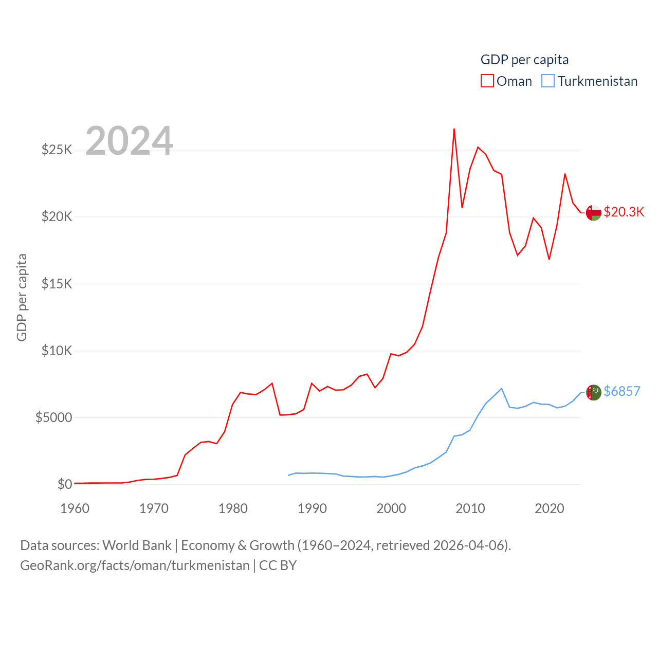 By GDP, Oman ranks 70/197 ($107B) and Turkmenistan ranks 92/197 ($51.4B). By GDP per capita, Oman ranks 57/197 ($20,285), while Turkmenistan ranks 104/197 ($6,857).