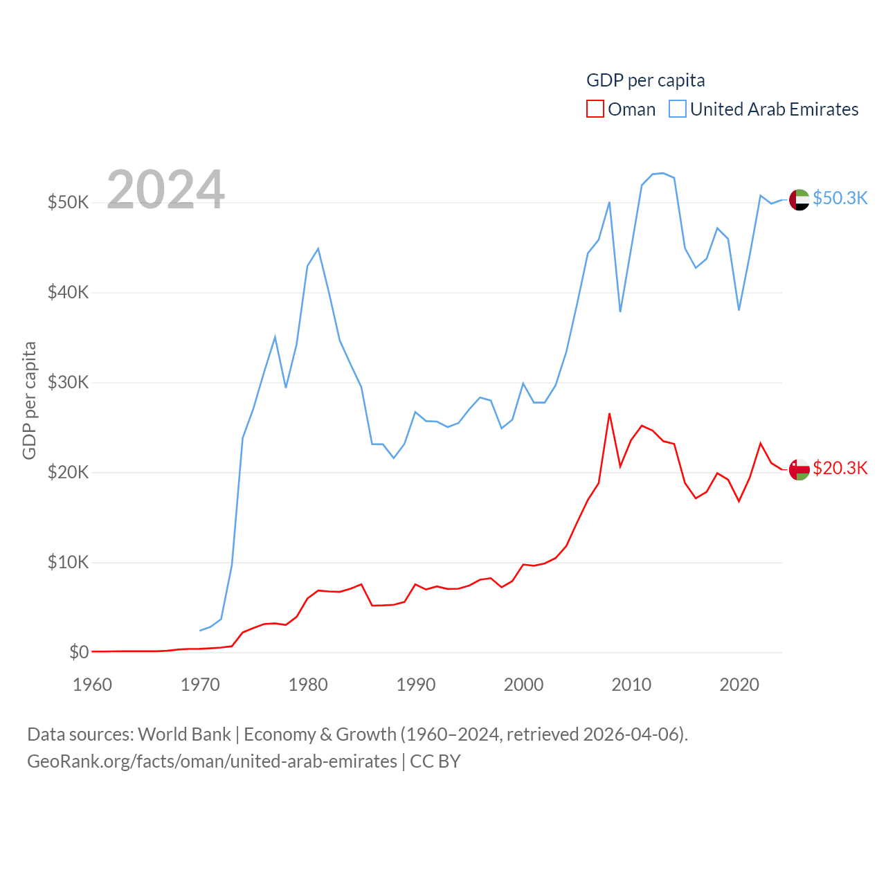 By GDP, Oman ranks 70/197 ($107B) and The United Arab Emirates ranks 27/197 ($552B). By GDP per capita, Oman ranks 57/197 ($20,285), while The United Arab Emirates ranks 24/197 ($50,274).