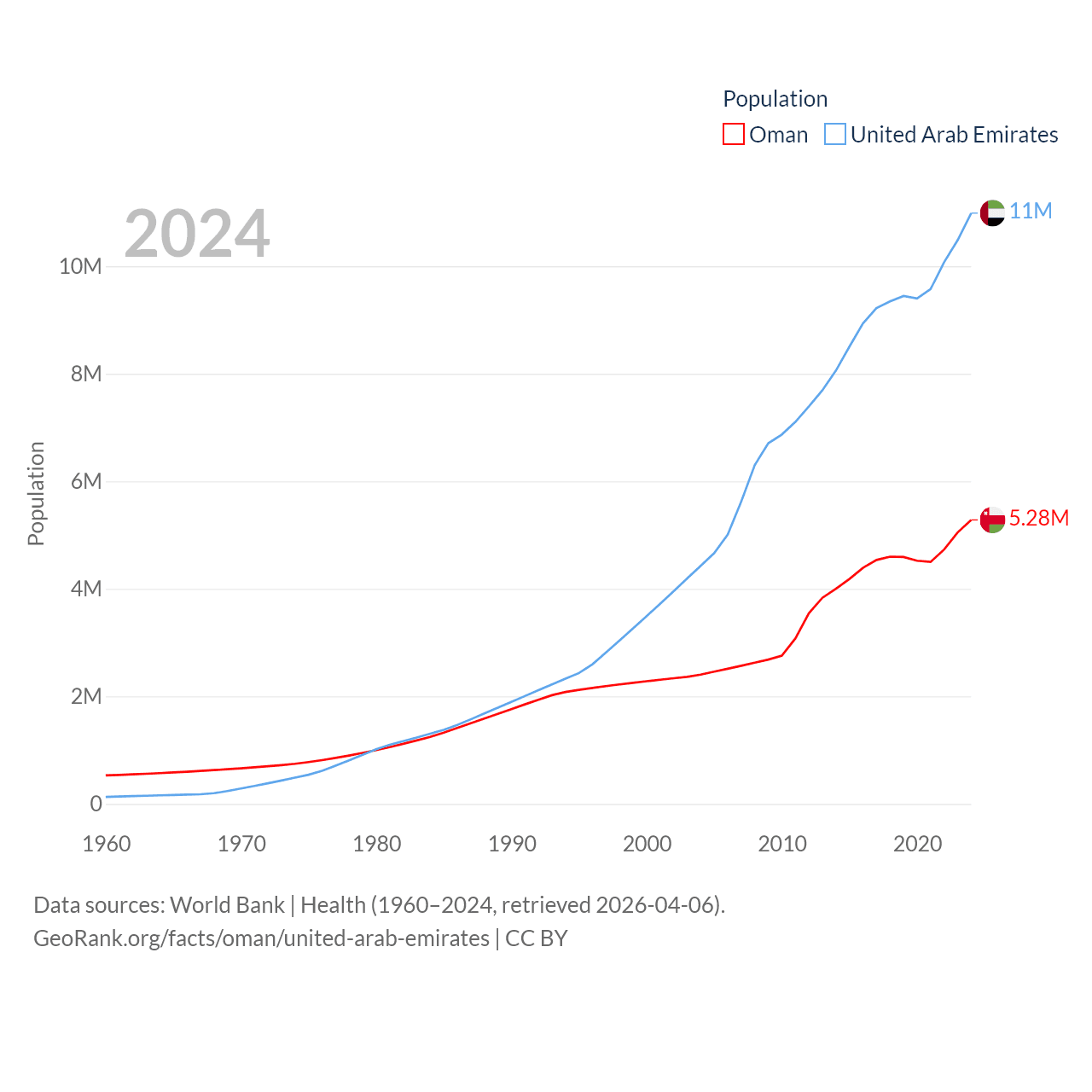 Oman has a population of 5.28M (ranked 124/197), compared with 11M in The United Arab Emirates (ranked 86/197). Oman's land area is 119,499 sq mi versus 27,421 sq mi for The United Arab Emirates (ranked 68th vs. 117th).