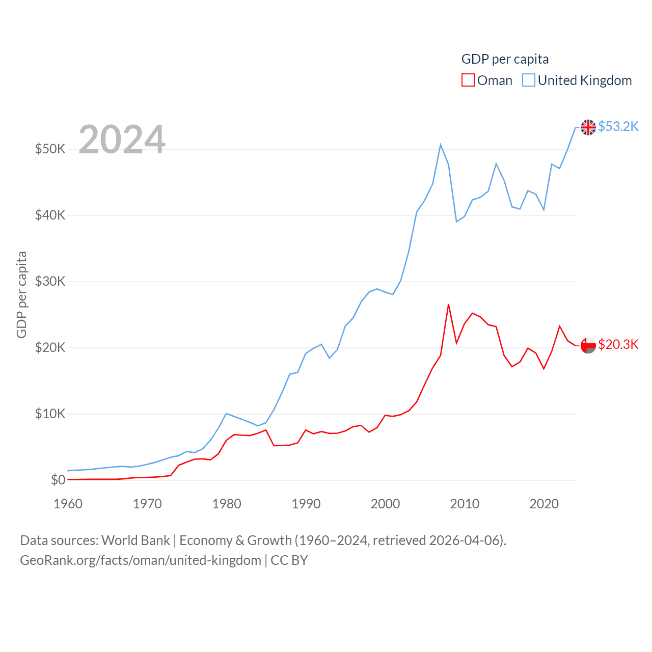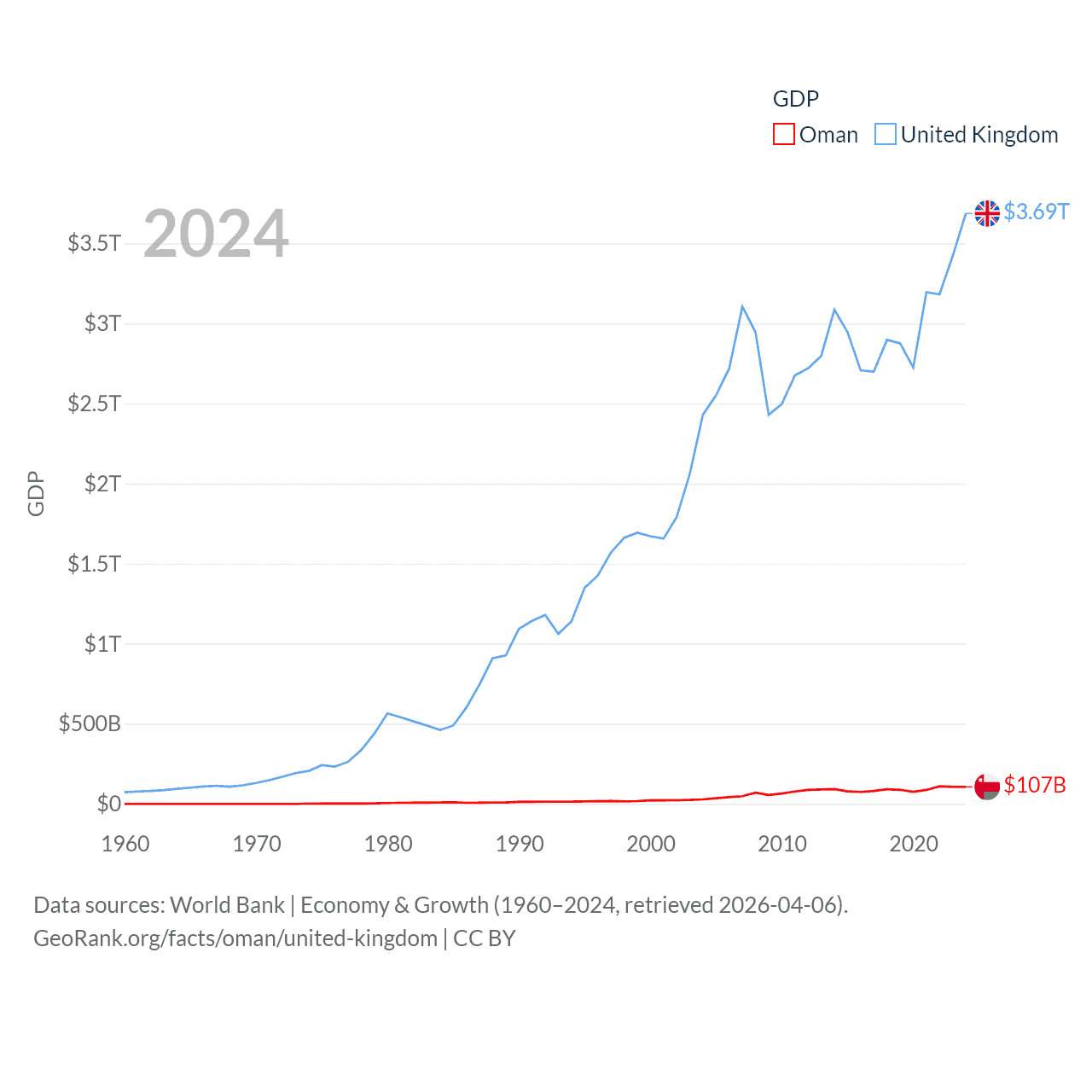By GDP, Oman ranks 70/197 ($107B) and The United Kingdom ranks 6/197 ($3.69T). By GDP per capita, Oman ranks 57/197 ($20,285), while The United Kingdom ranks 22/197 ($53,246).