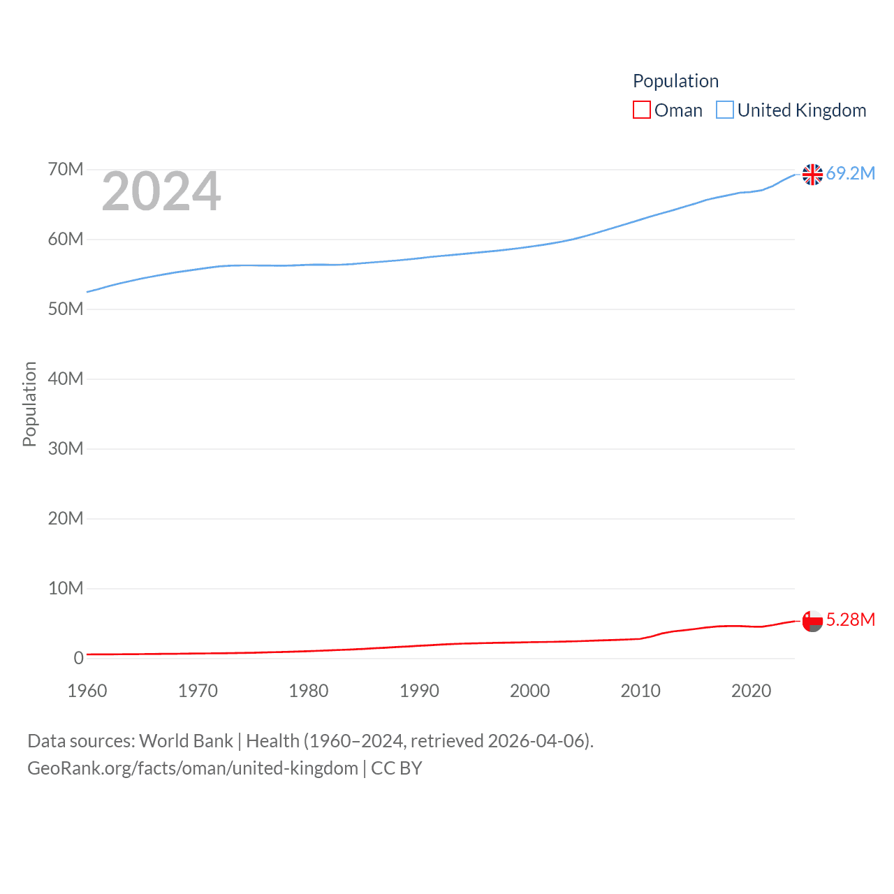 Oman has a population of 5.28M (ranked 124/197), compared with 69.2M in The United Kingdom (ranked 21/197). Oman's land area is 119,499 sq mi versus 93,410 sq mi for The United Kingdom (ranked 68th vs. 78th).